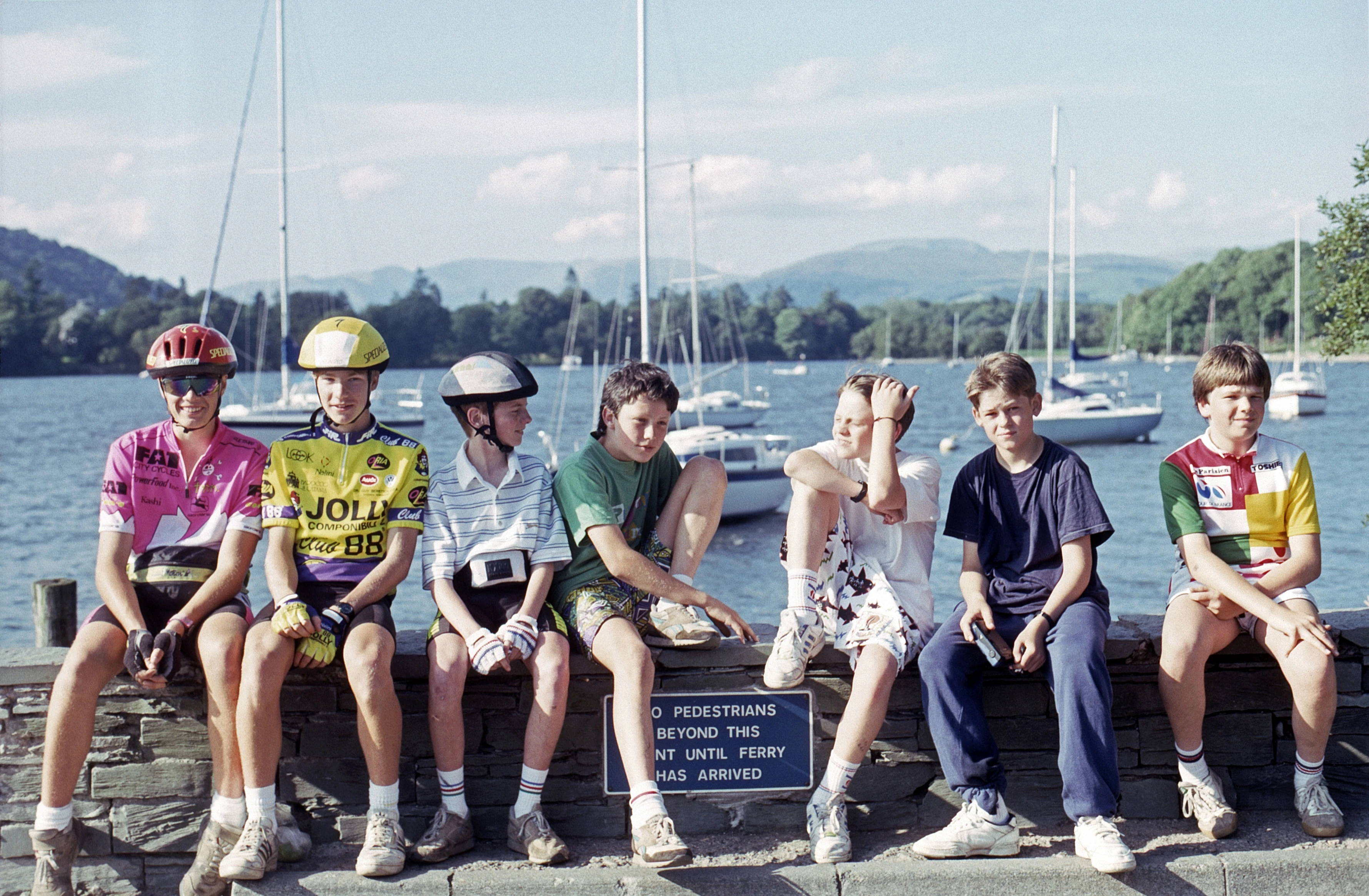 First ferry left without us, so a group photo at Bowness ferry terminal, looking north to Belle Isle.