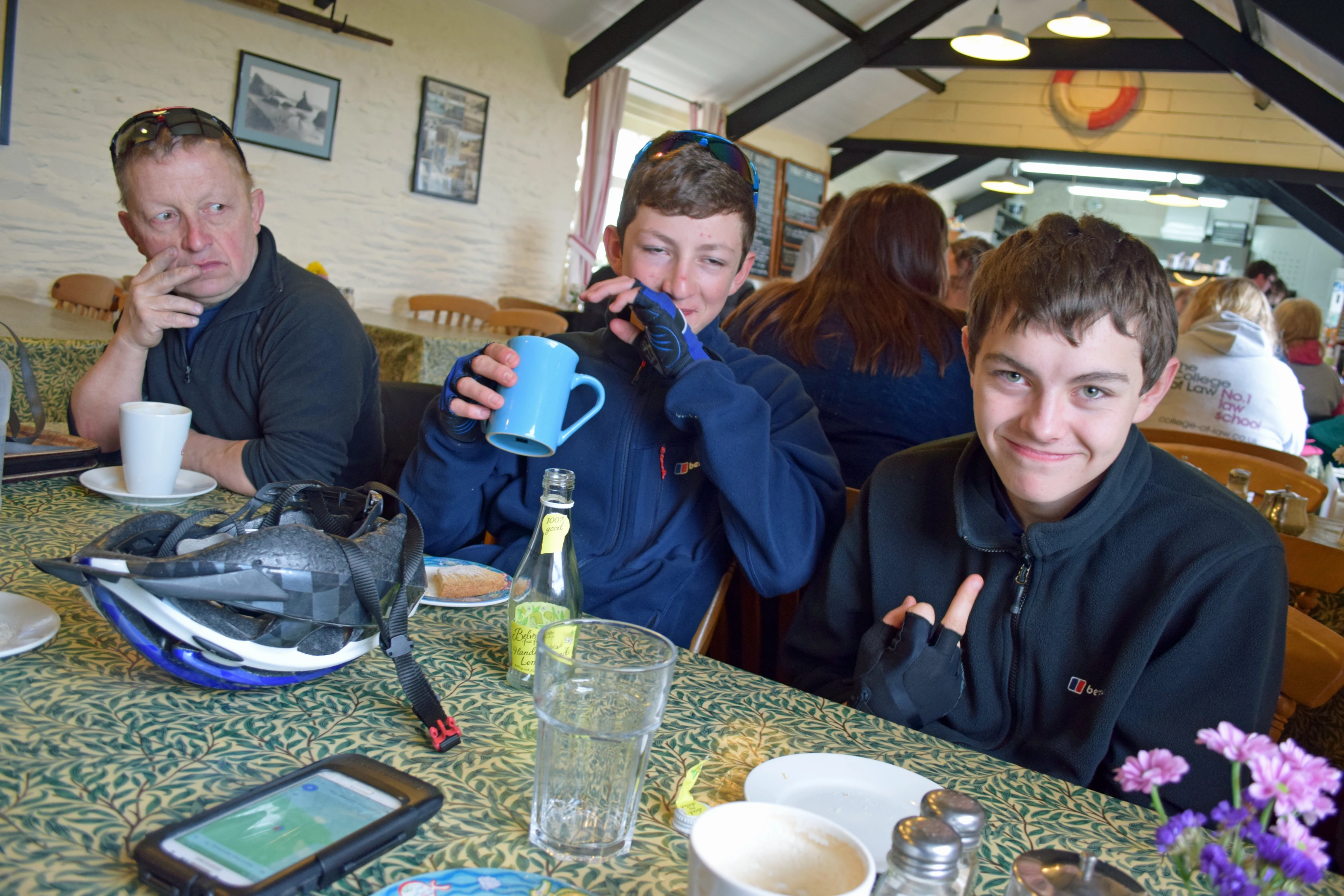 John, George and Dillan at Carnewas Tea Room, Bedruthan Steps.