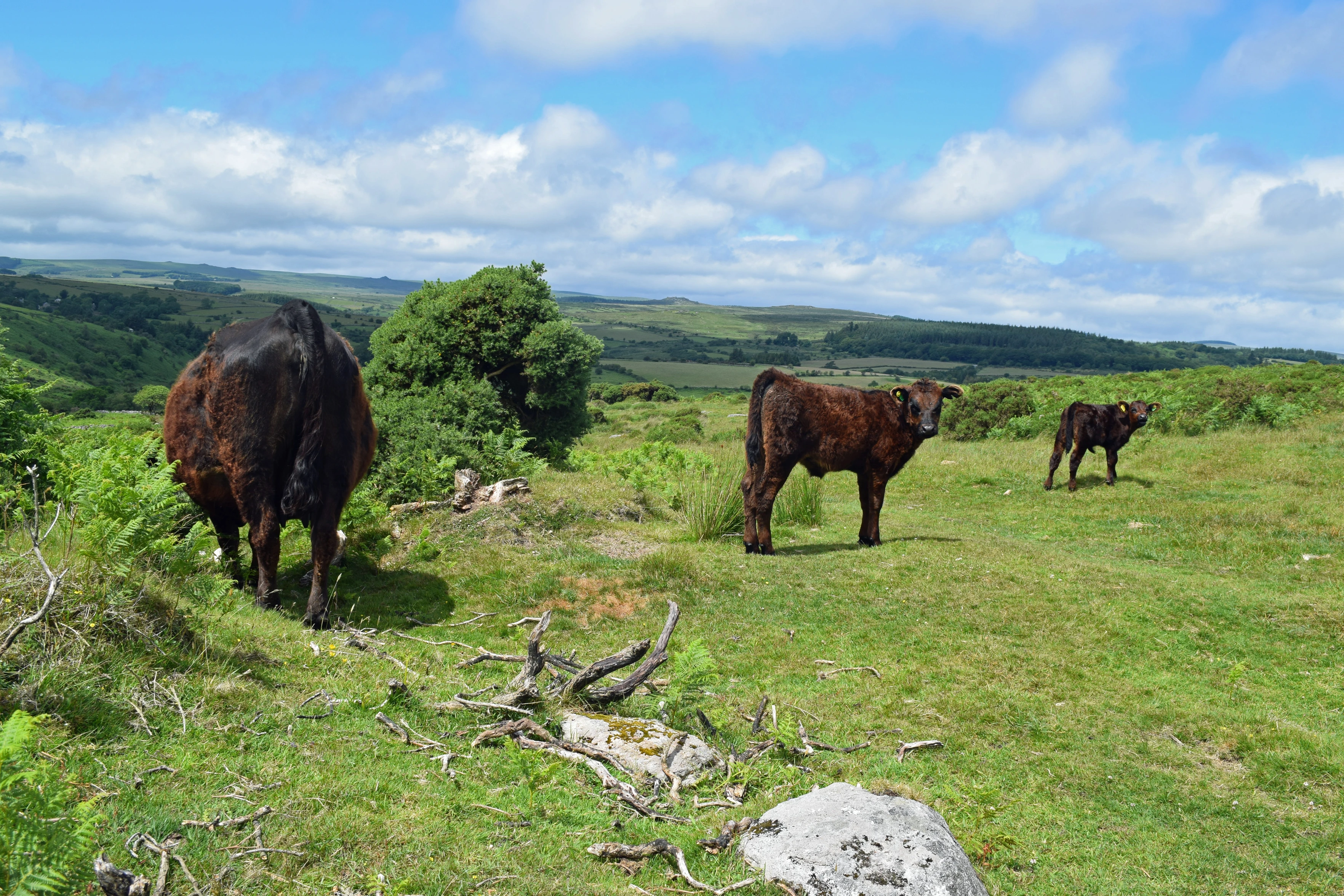 Cow and calves on the climb to Combestone Tor.