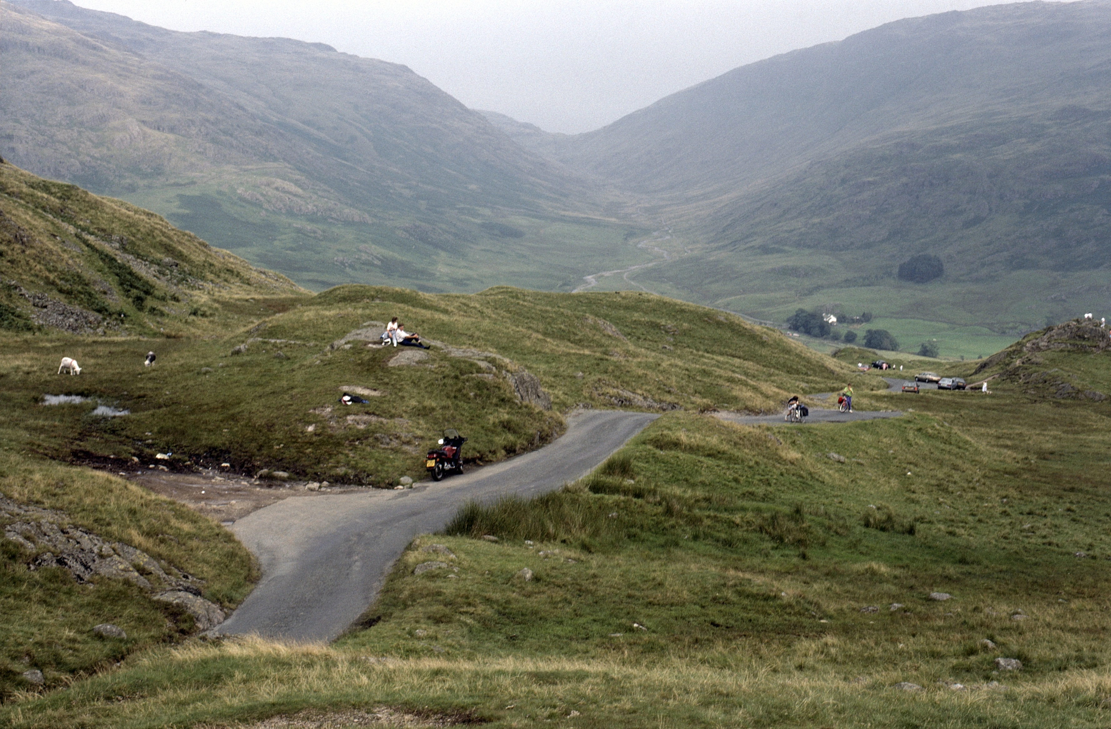 Looking back to Wrynose Bottom from near Hardknott’s top as the rest tackle the final hairpins