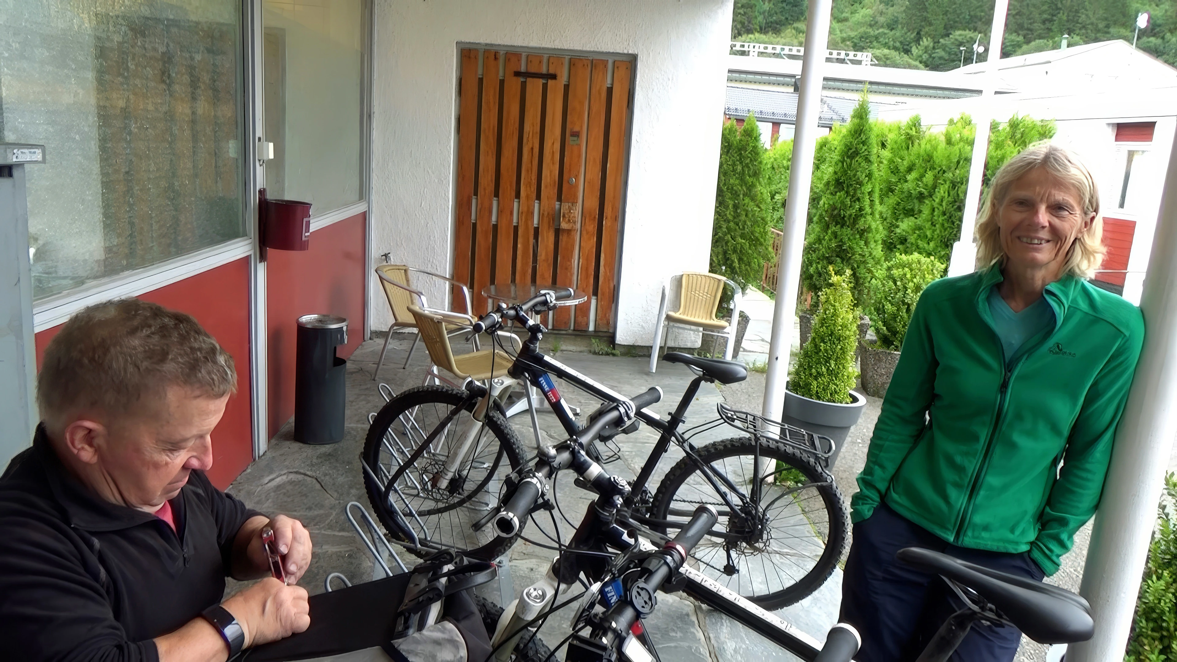 John chats to an Australian cyclist outside Bergen Montana youth hostel