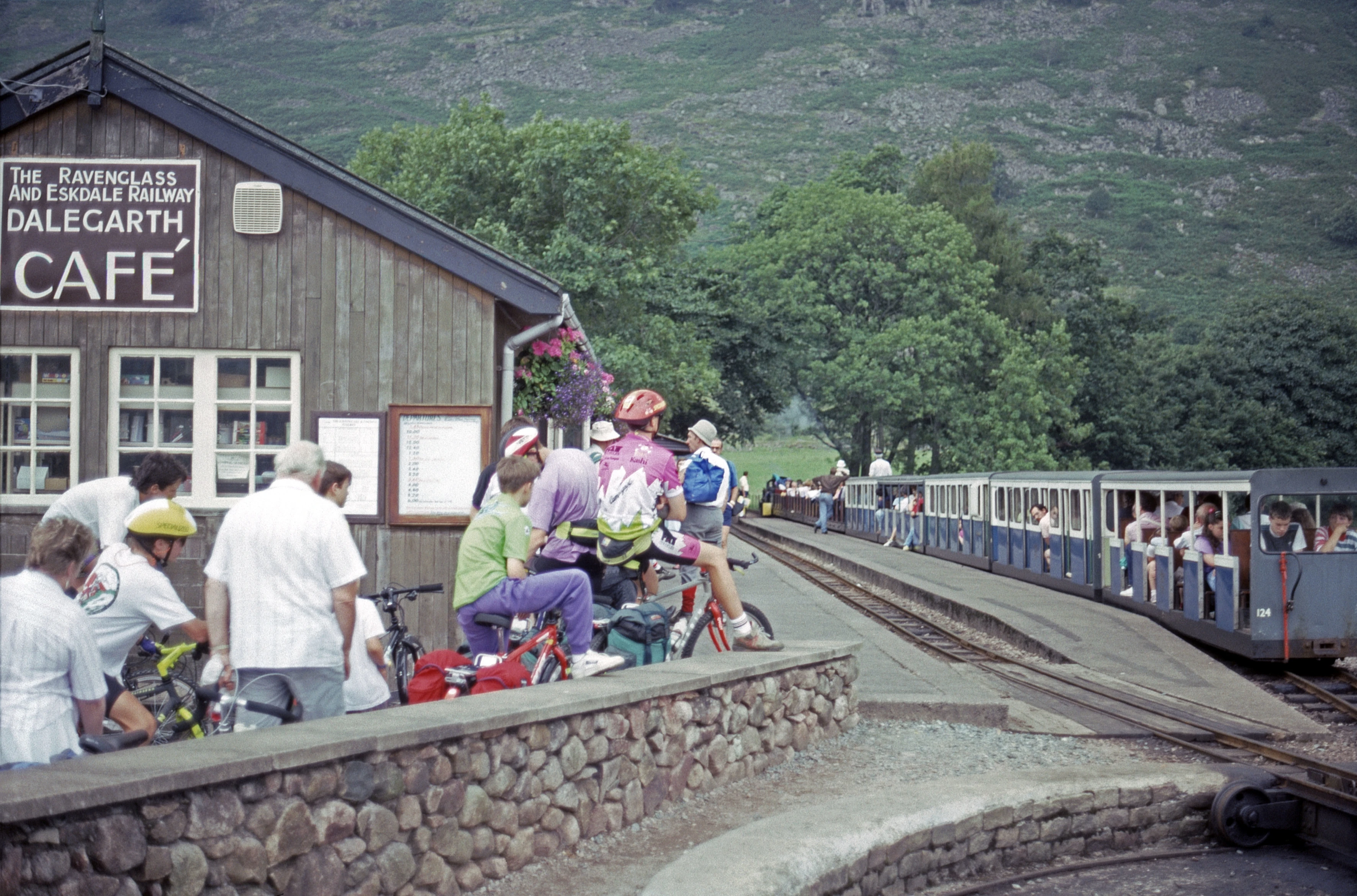 The crew watch a miniature train depart Dalegarth on the Ravenglass and Eskdale Railway