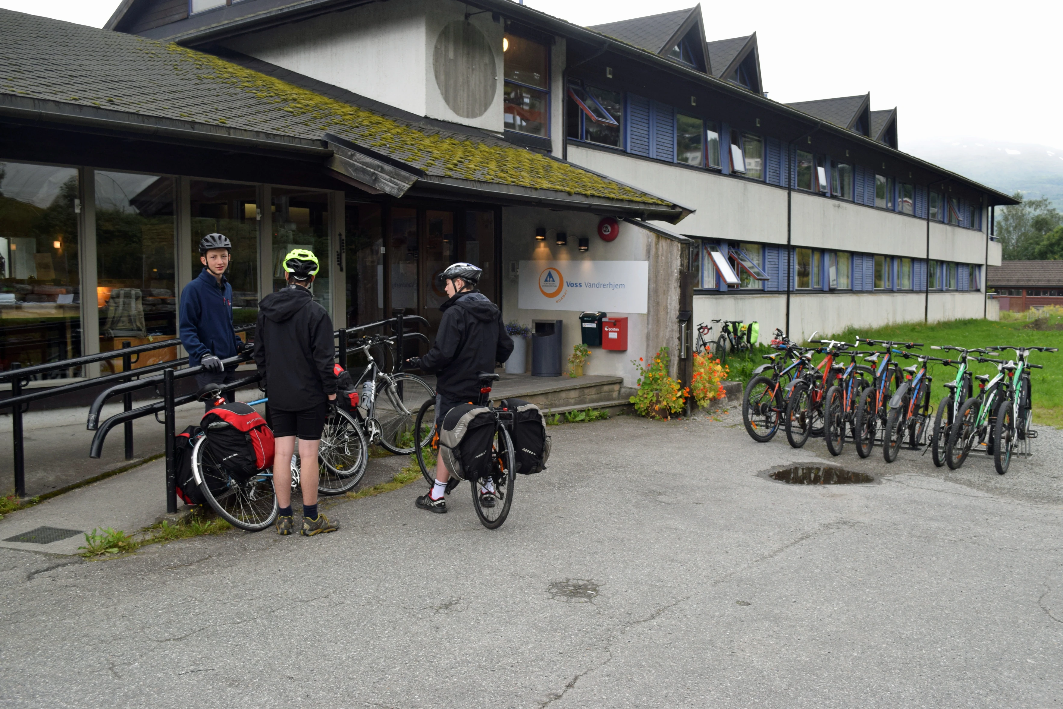 George, Jude and Dillan outside Voss Youth Hostel.
