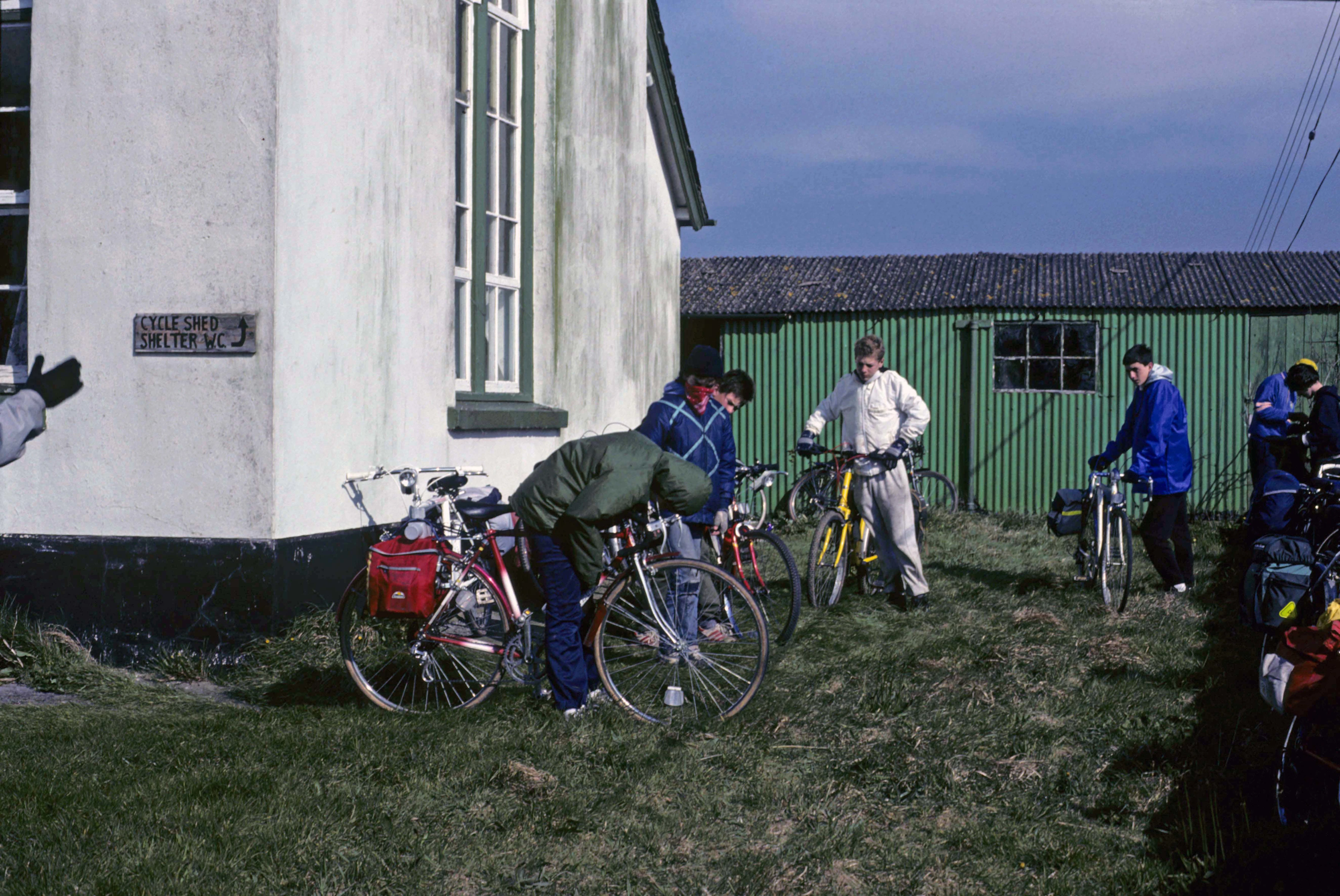 Preparing to leave Hartland Youth Hostel; corrugated‑iron bike shed and outdoor loo behind.