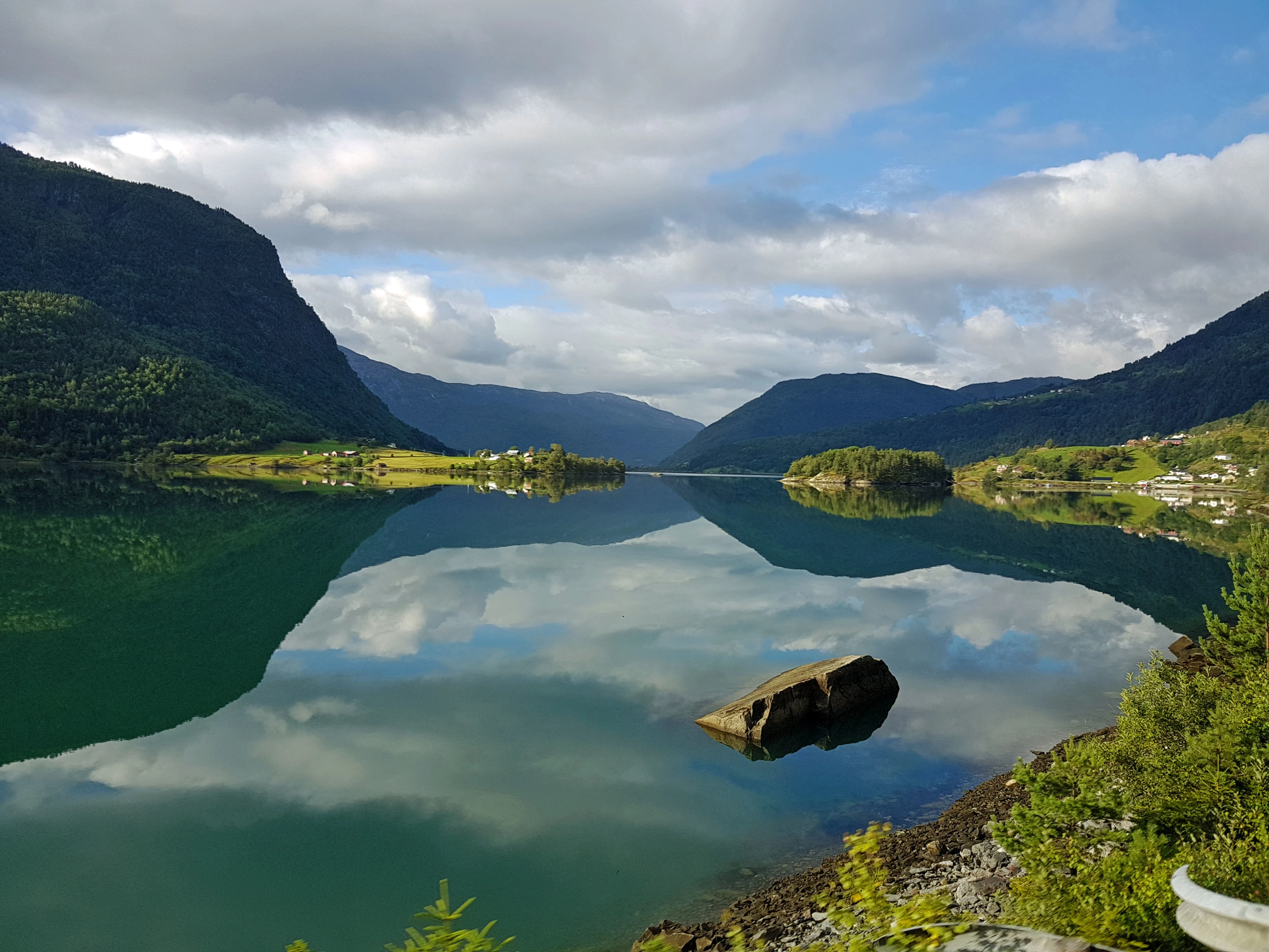 Barsnesfjorden and the Isle of Øyna, seen from the Glacier Bus.