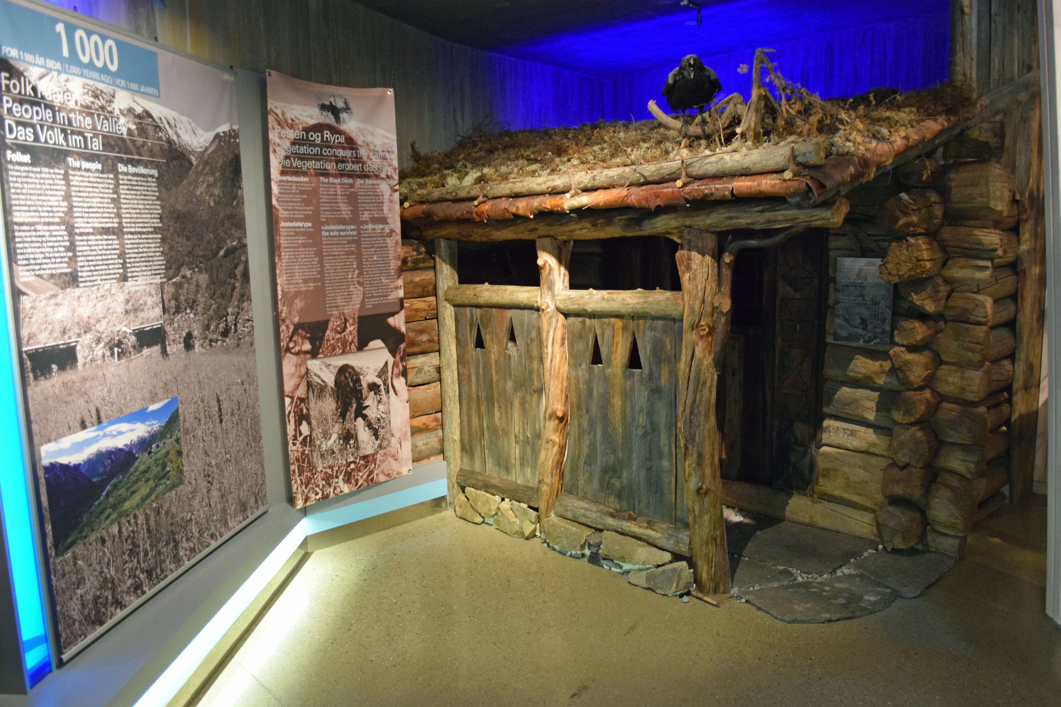 Reconstructed Black Death isolation hut in the glacier exhibition.