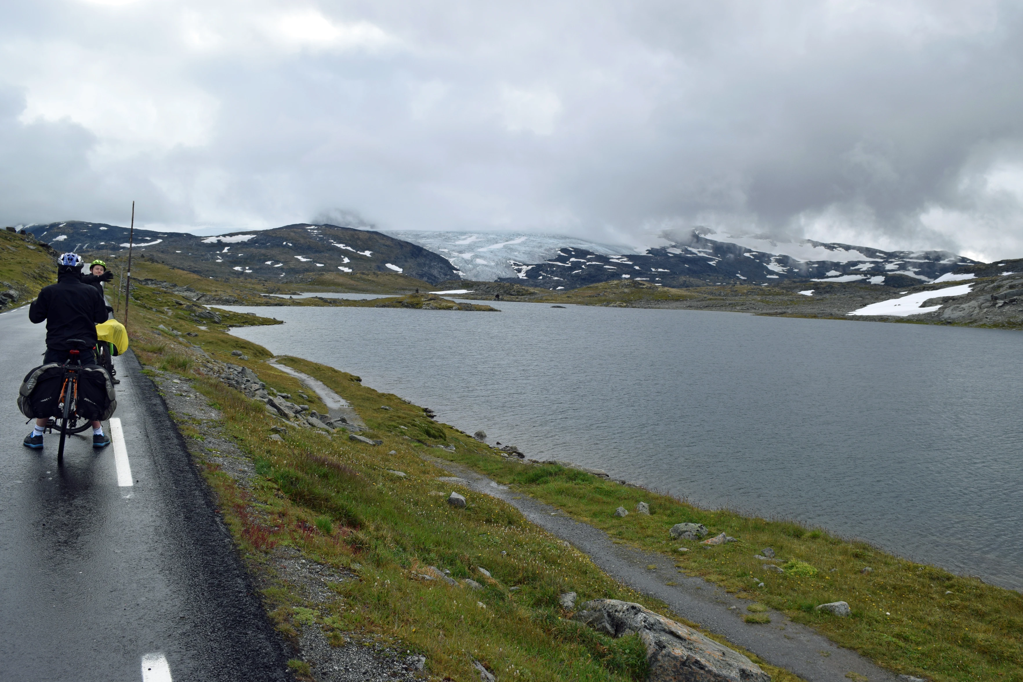 Fantesteinsvatnet and the road to Fantesteinen; Galdhøpiggen hides in the clouds beyond.