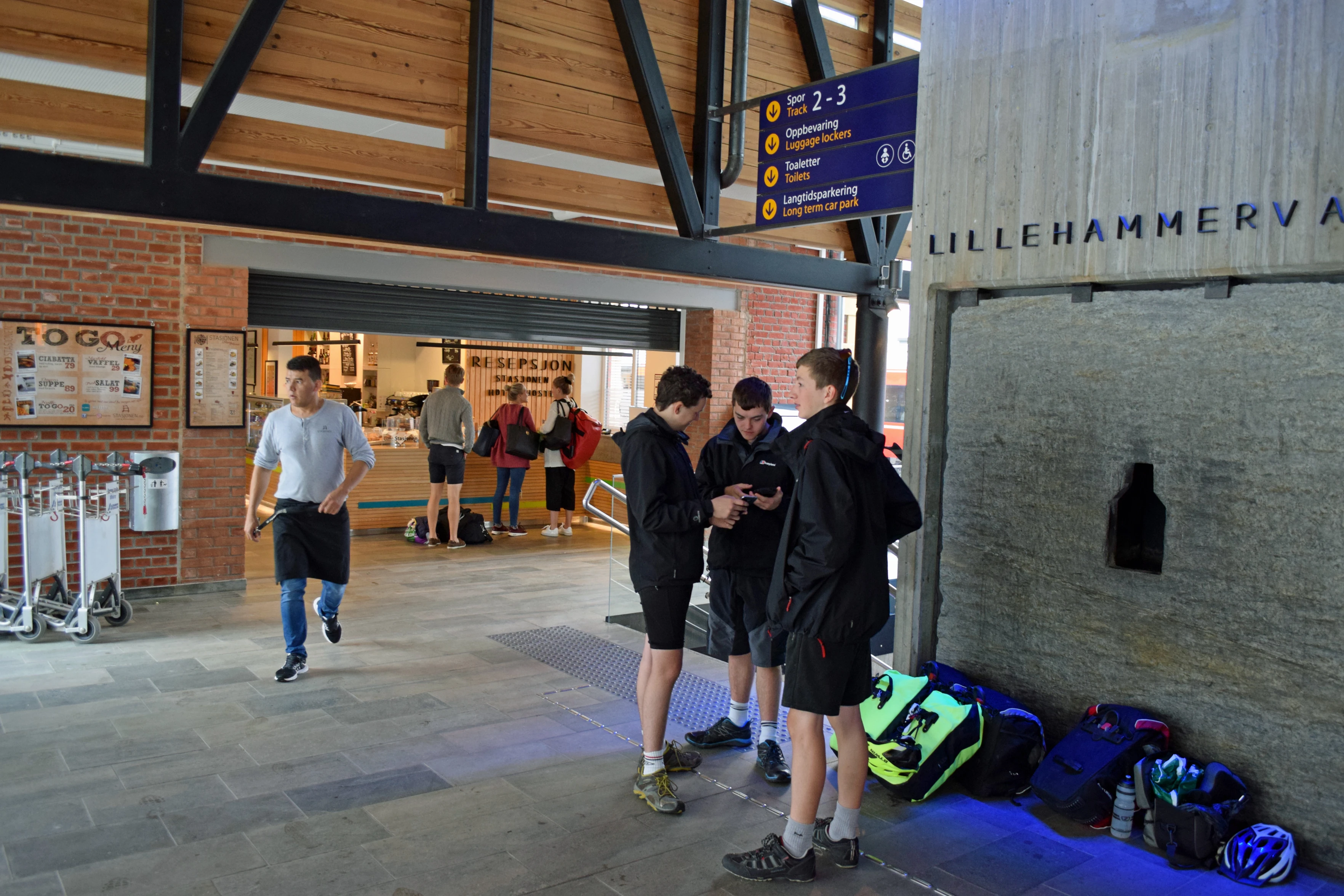 Lillehammer youth hostel reception inside the station, with Chef strolling past.