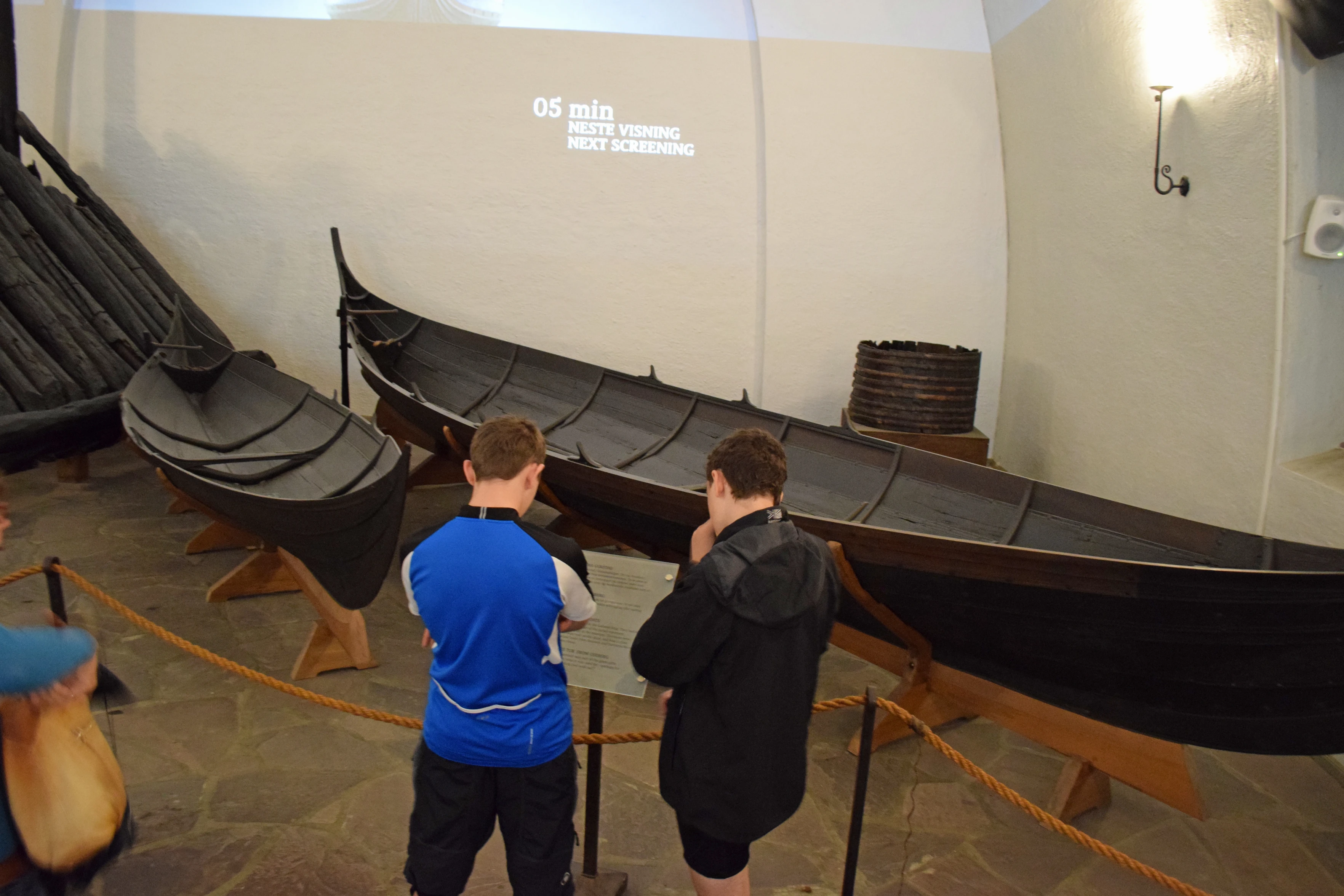 Jude and Dillan study a burial chamber and small boats from the Gokstad mound