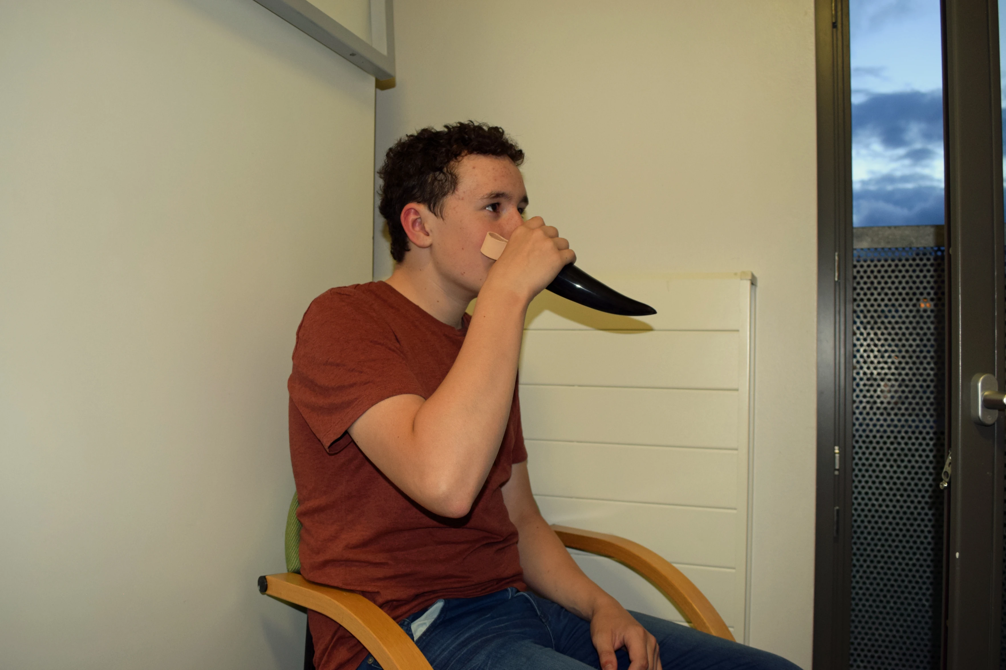 Jude tests his Viking drinking horn with tea at Oslo Haraldsheim youth hostel