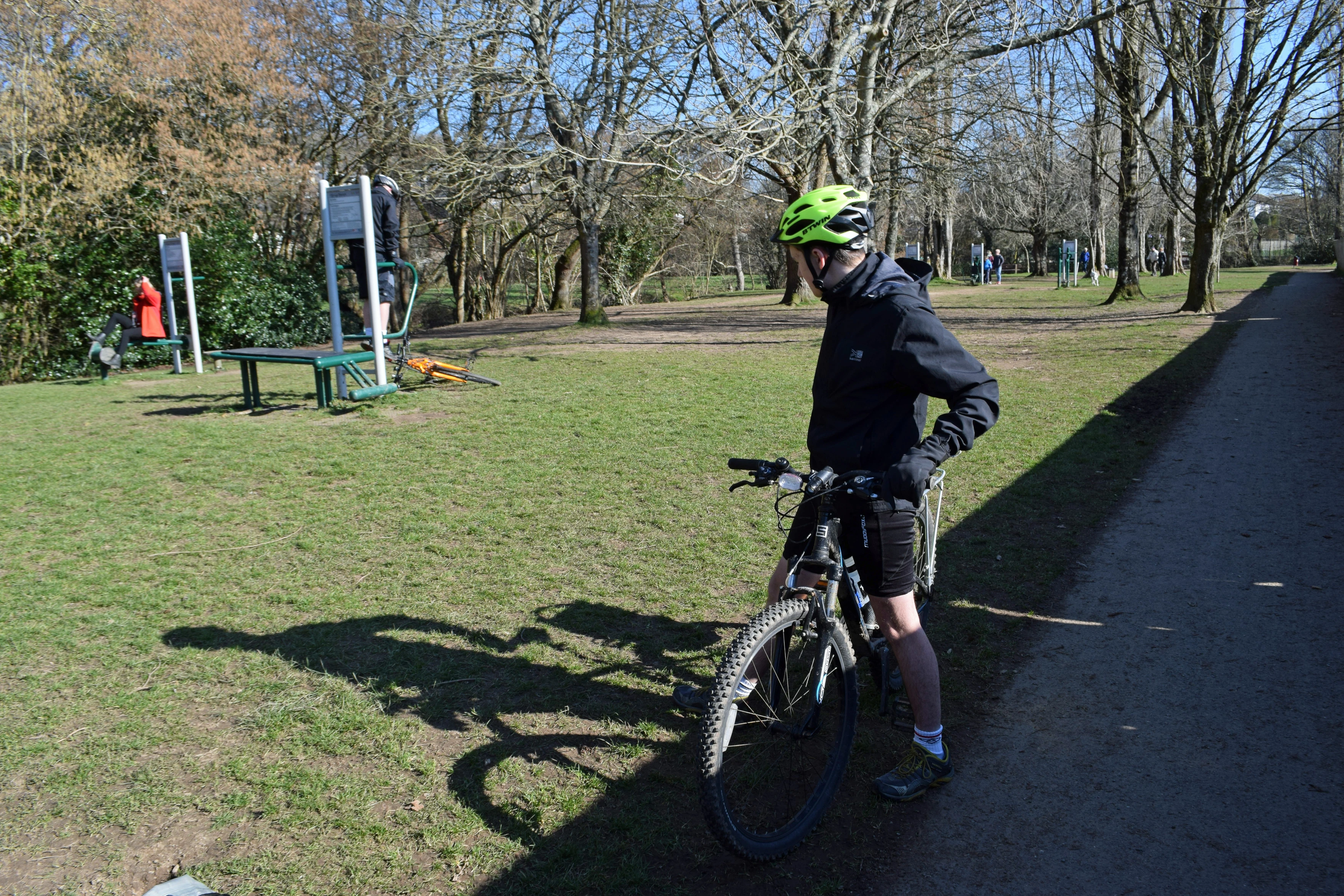 Dillan investigates the outdoor exercise machines in Mill Marsh Park, Bovey Tracey.