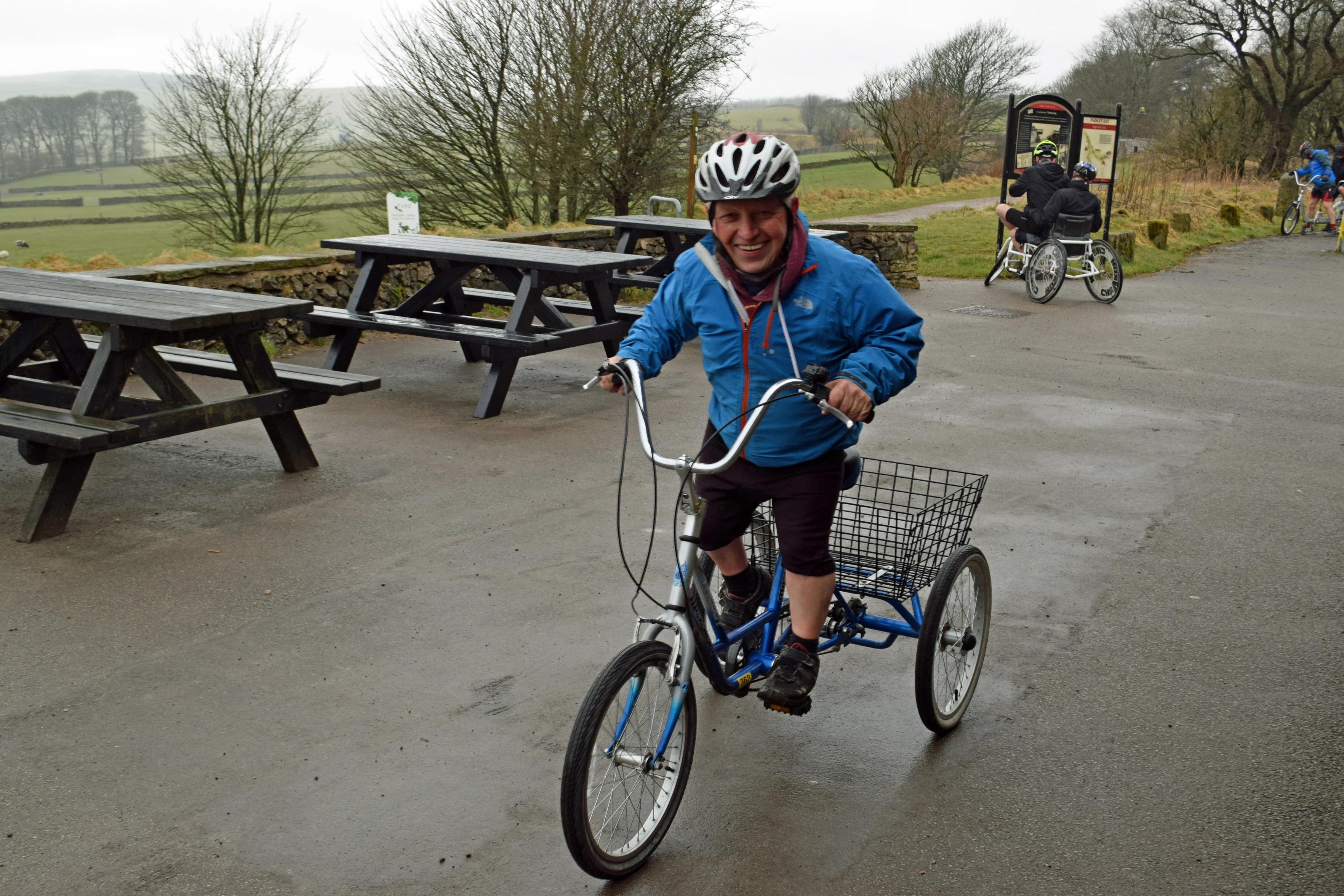 John tests the shopping trike at Parsley Hay Cycle Hire