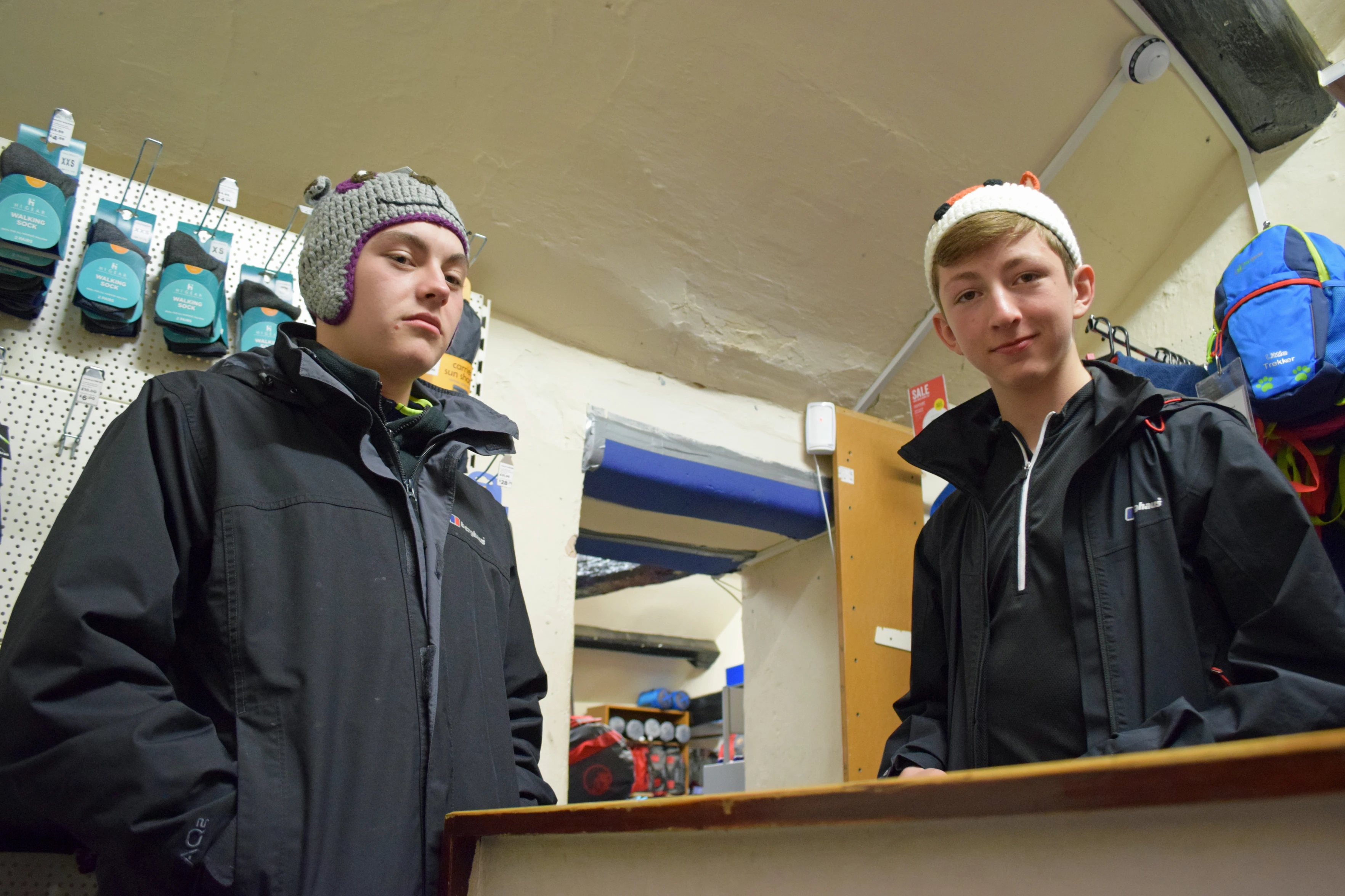 George and Dillan model the ridiculous hats in Go Outdoors, Hathersage