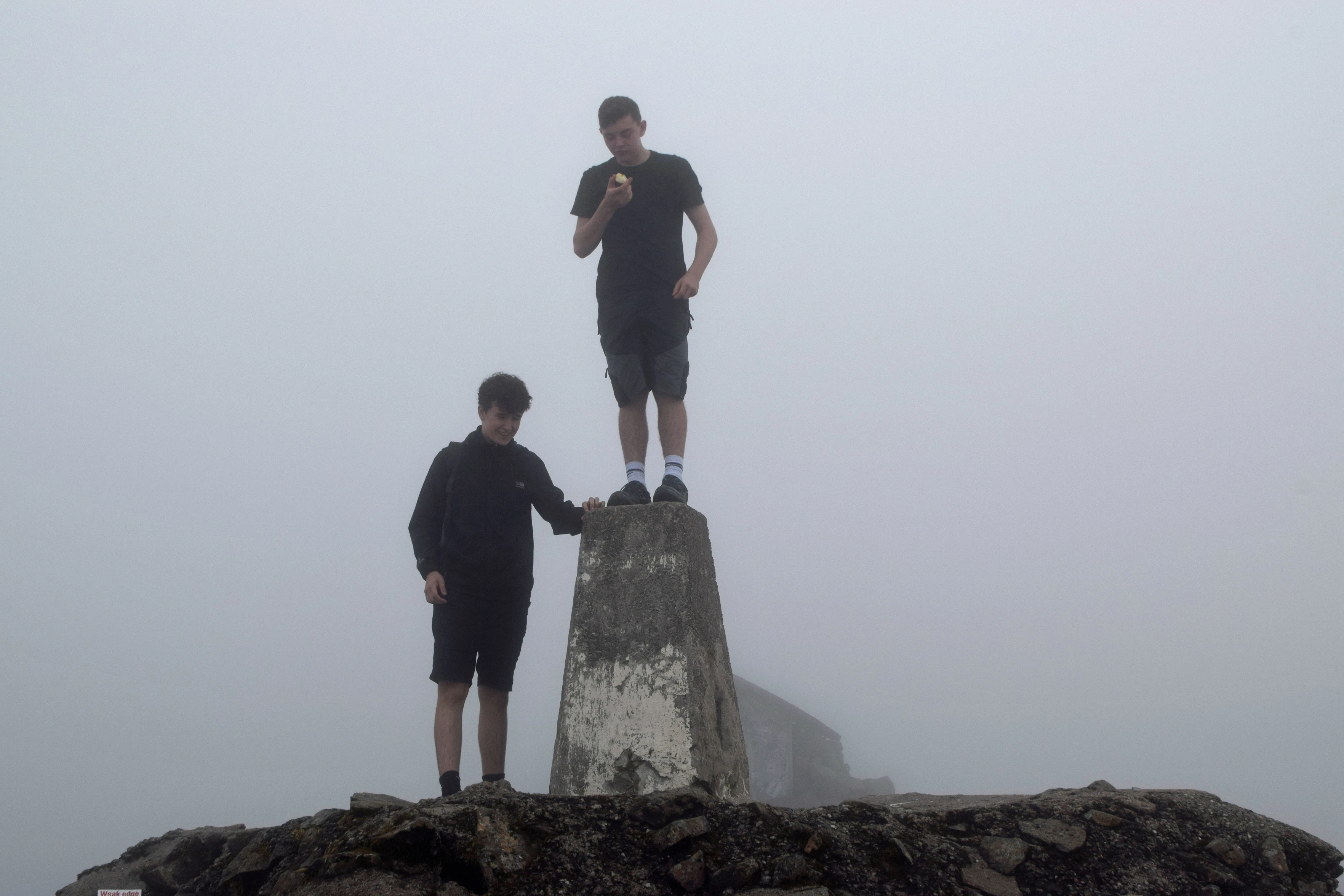 Dillan and Jude on the Ben Nevis trig point, 1345 m above sea level.