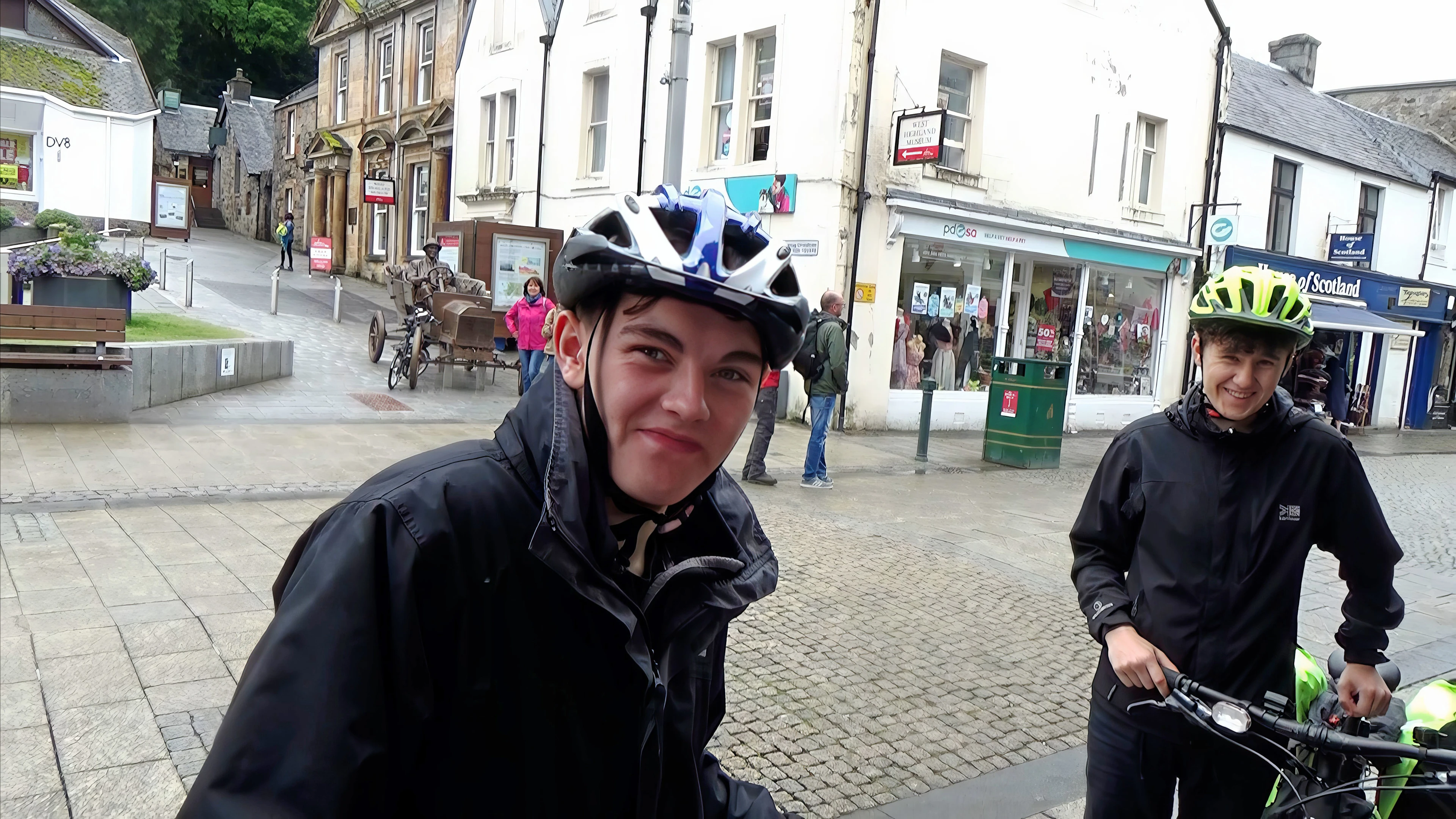 Dillan and Jude outside Nevis Bakery, Fort William.