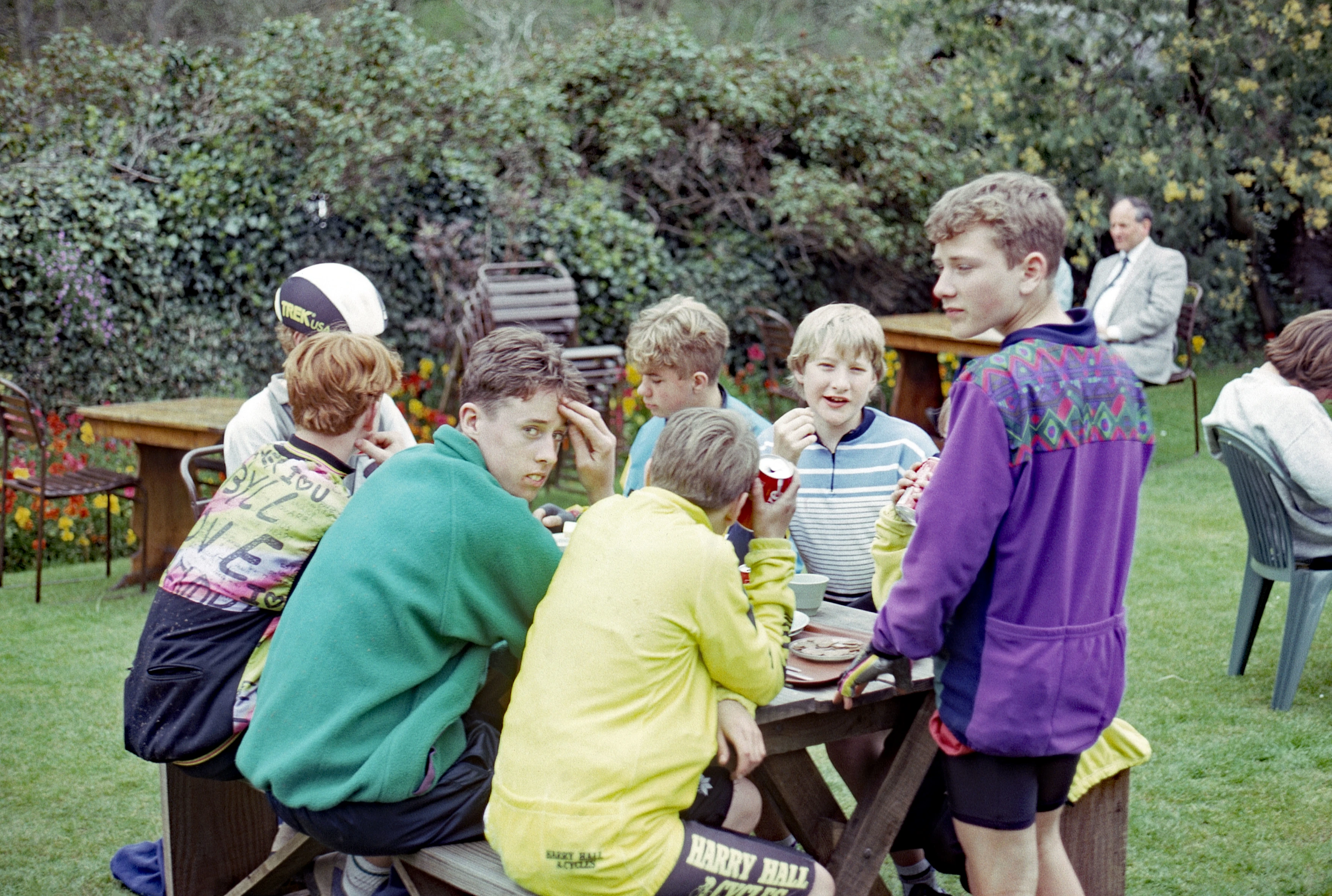 Horner cafe, West Luccombe: Seb Lessware, Jonathan Burgess, Ian Gibbs, Anthony Lowne, Nicholas Lowne, Roger Whalley?, Dan Whittle, David Platt.