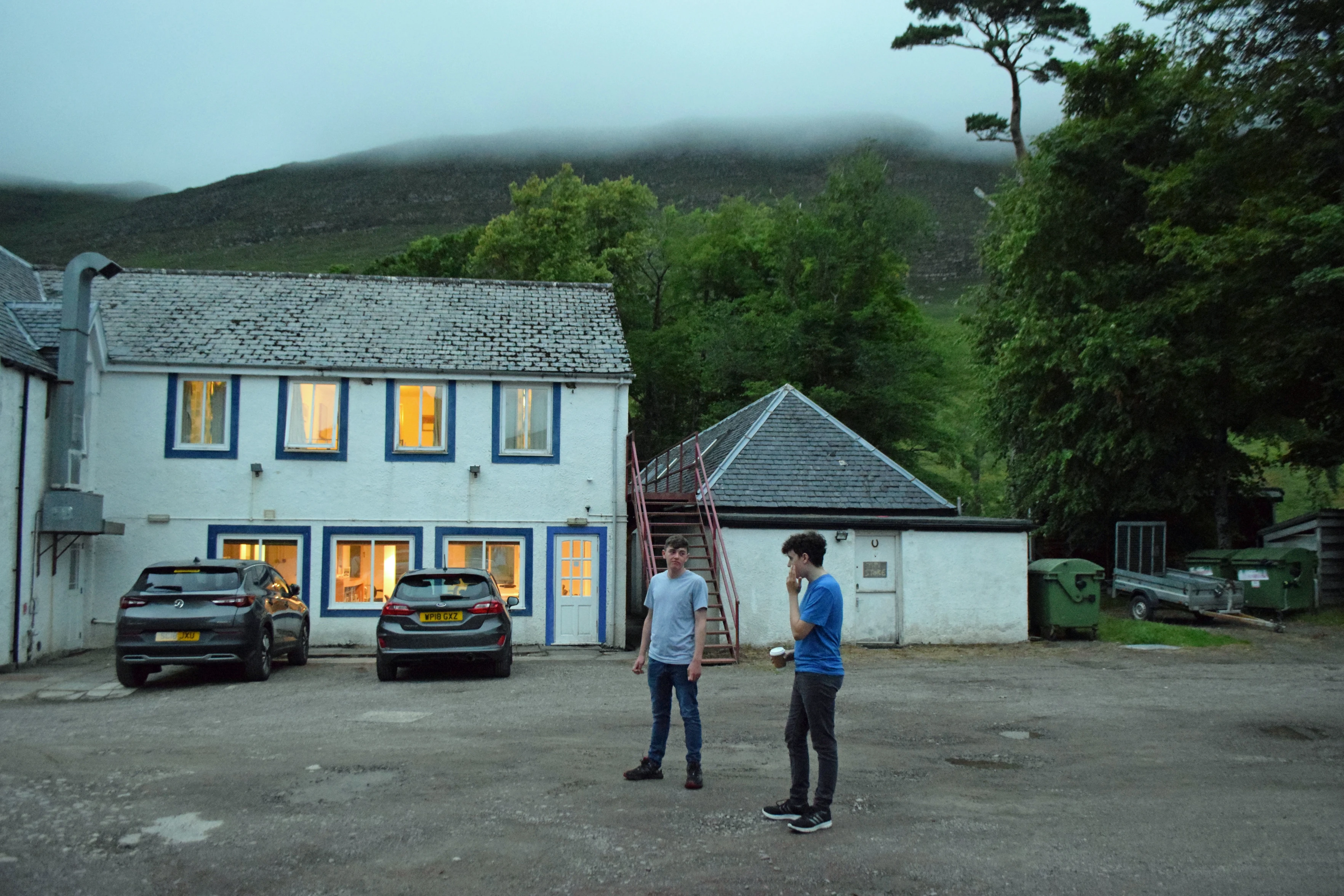 Dillan and Jude outside Applecross Youth Hostel