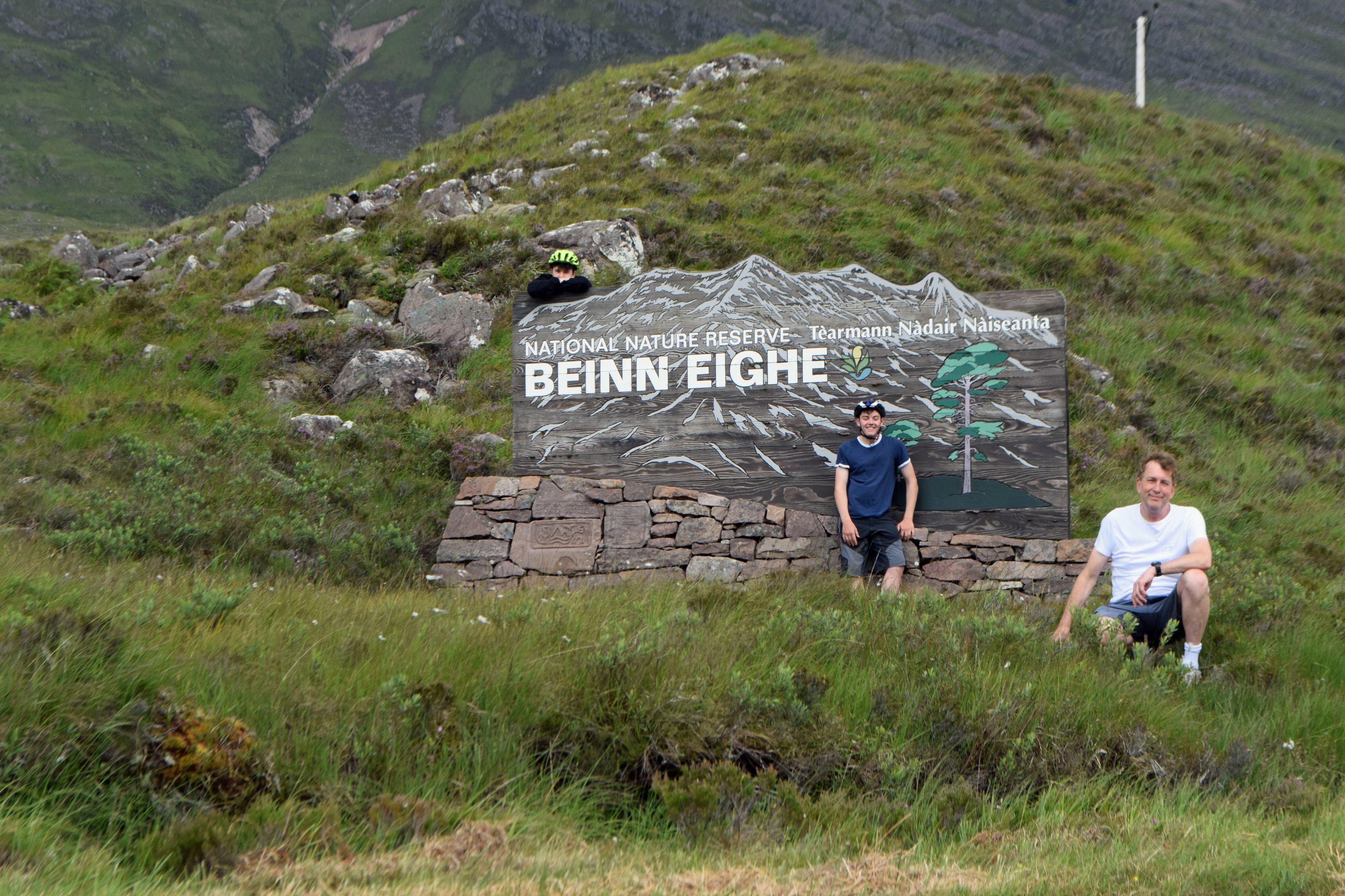 Jude, Dillan and Michael at the Beinn Eighe National Nature Reserve sign.