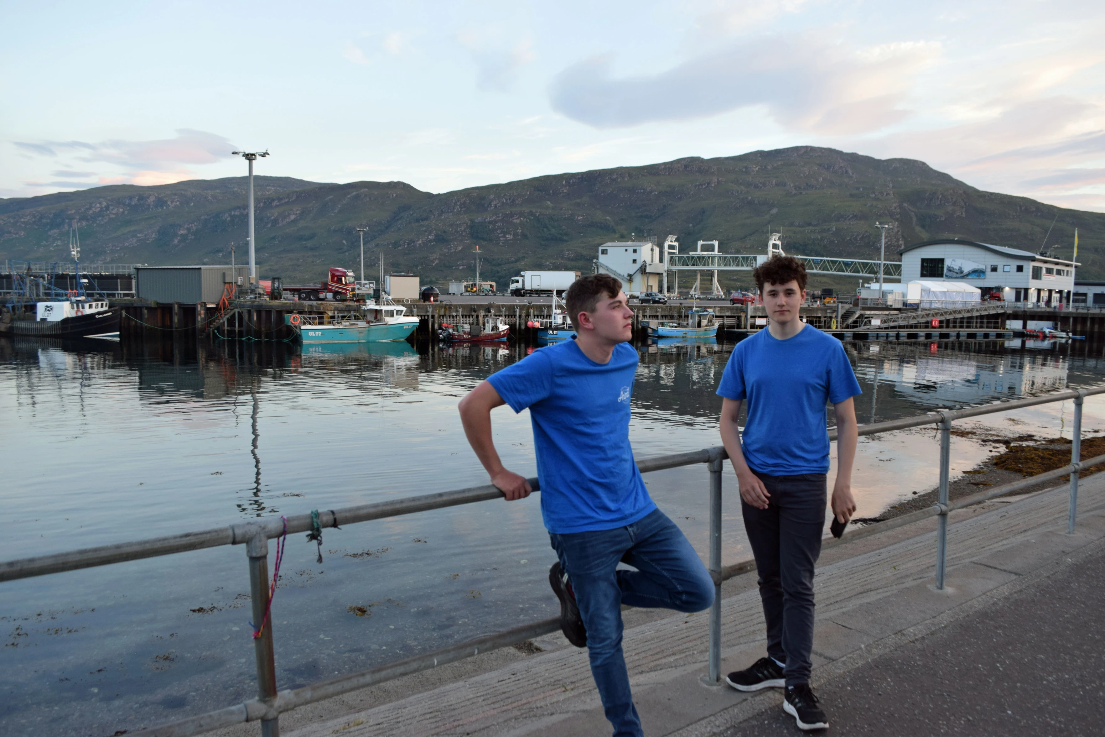 Dillan and Jude on Shore Street, Ullapool, with the ferry pier behind