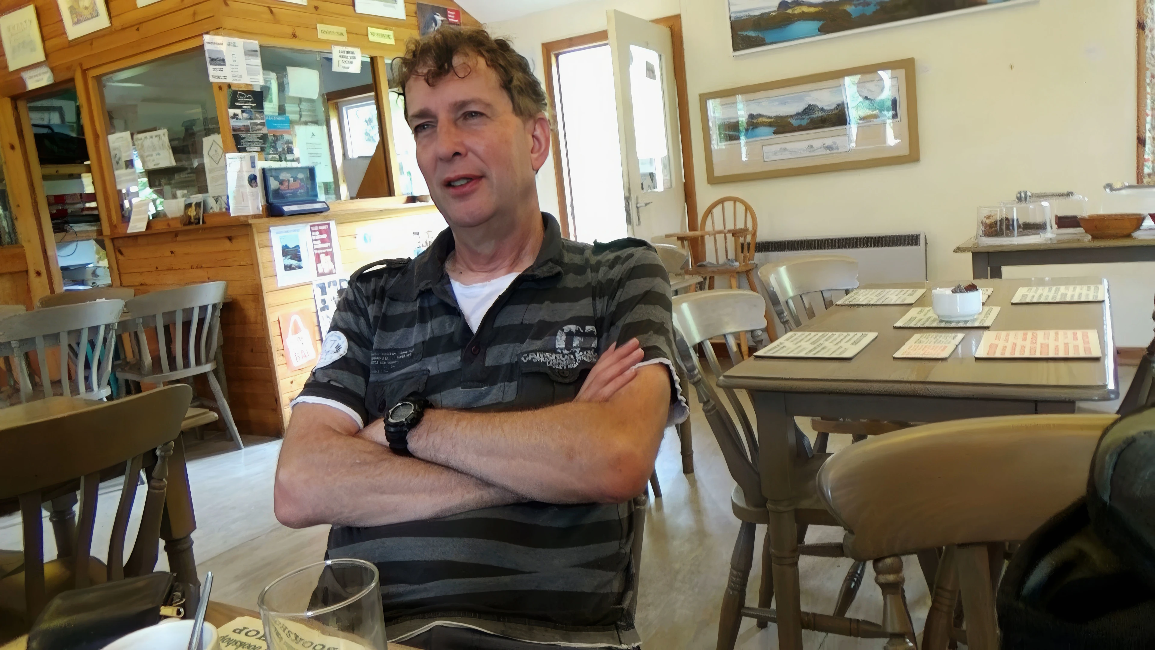 Michael enjoying a coffee at Achins Bookshop, Inverkirkaig.