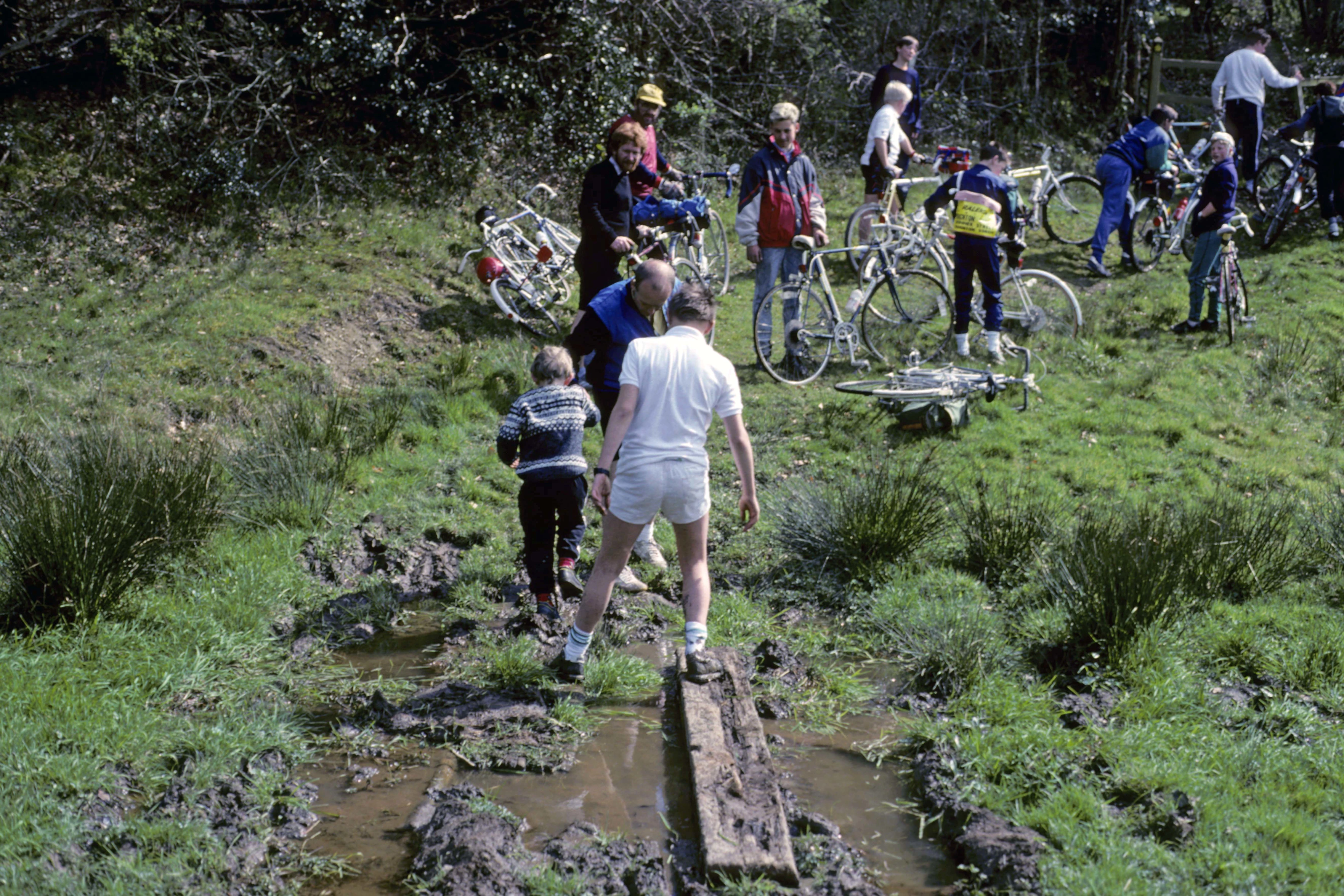 Shane helps Paul across the plank over the bog beyond Holcombe Burnell church
