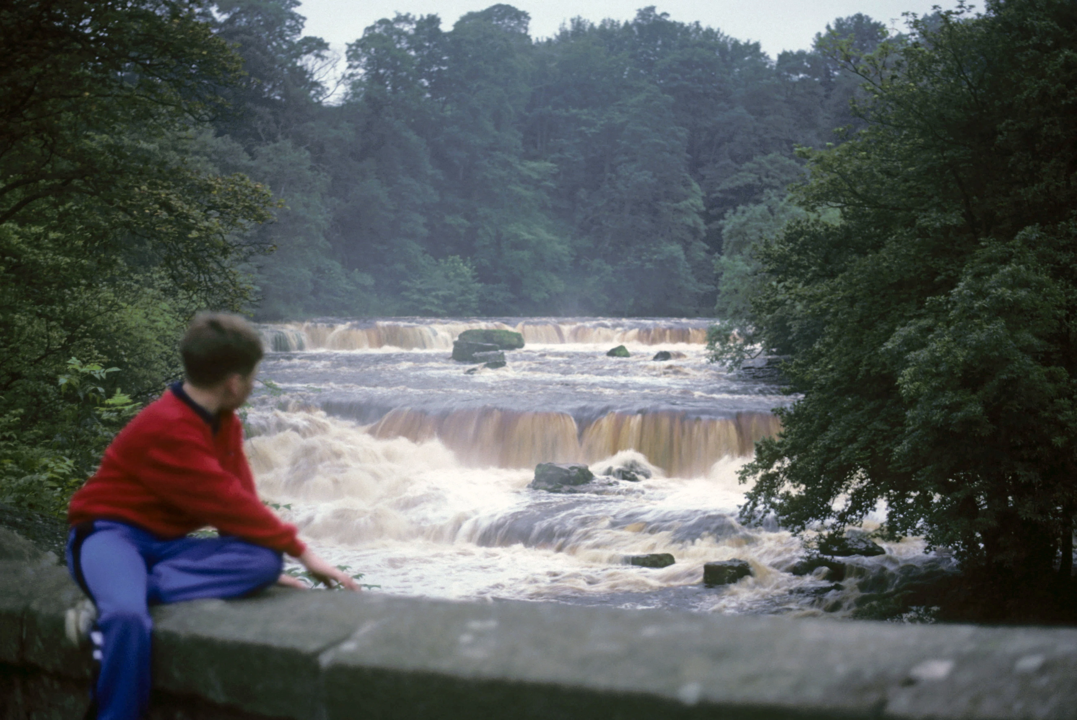 Aidan watches Aysgarth Falls in spate from the bridge over the Ure.