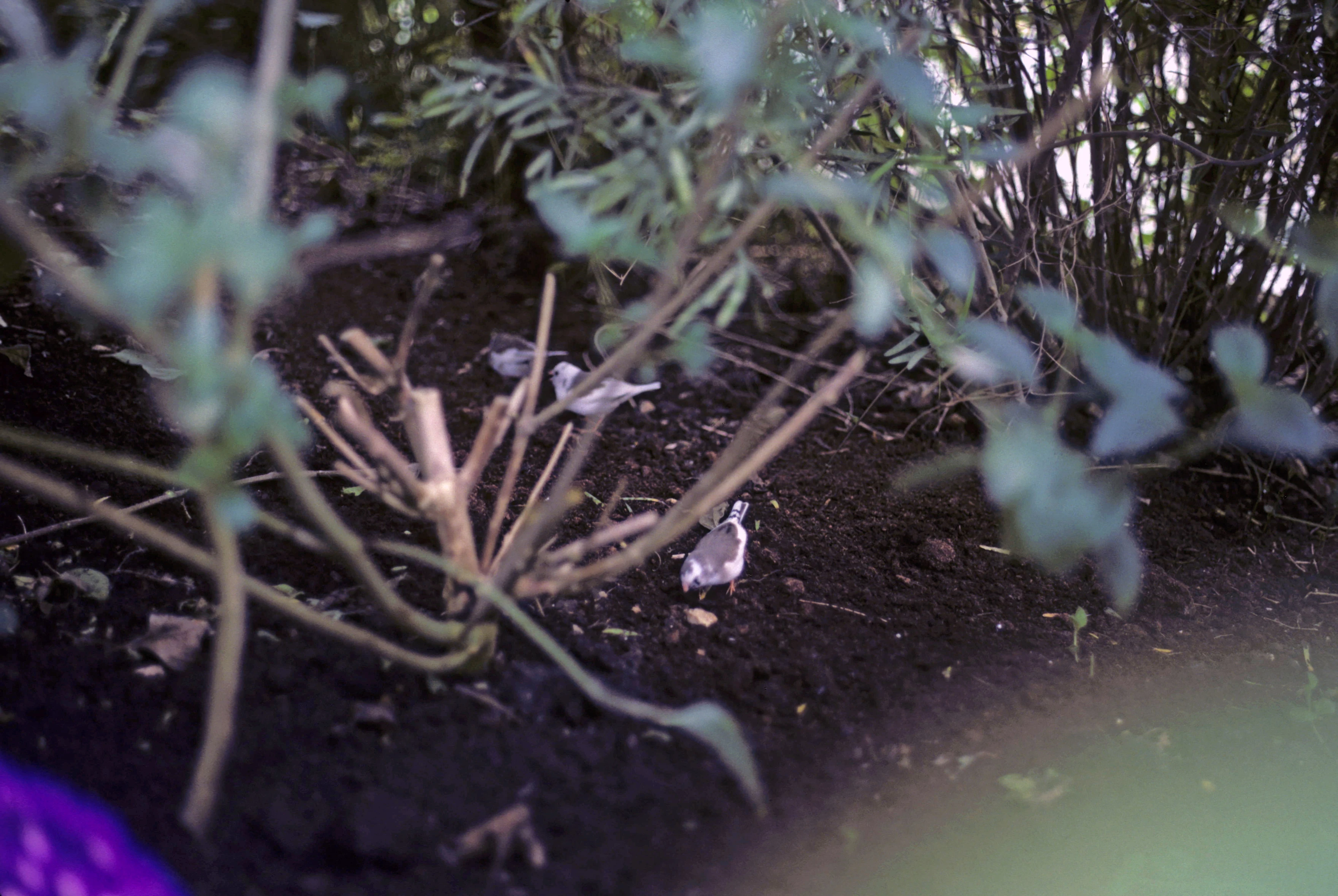 Zebra finches mooching under the vegetation at the New Forest Butterfly Farm.