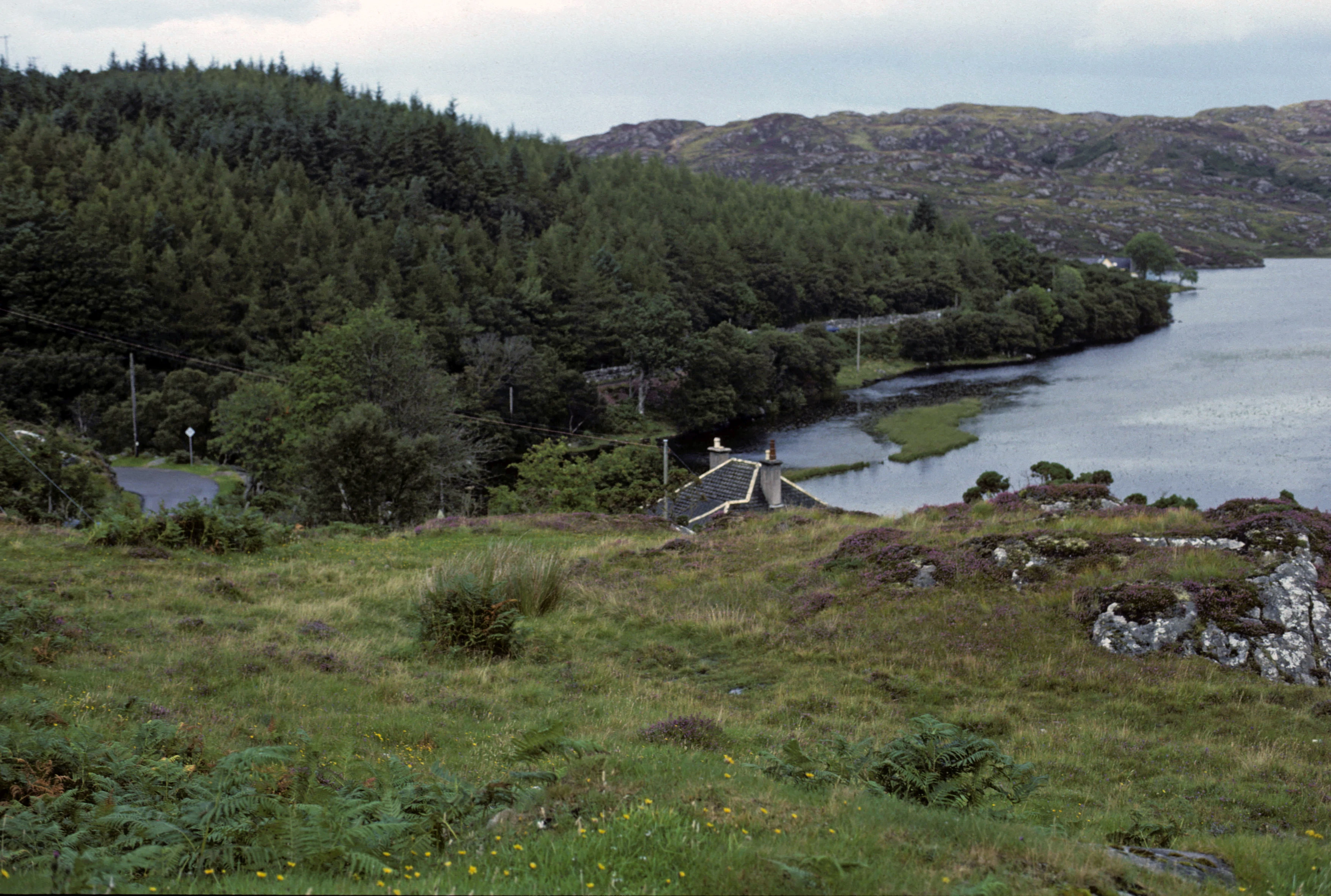 Loch Culag from the top of the hill near Strathan, descending to Lochinver; the primary school sits on its edge.