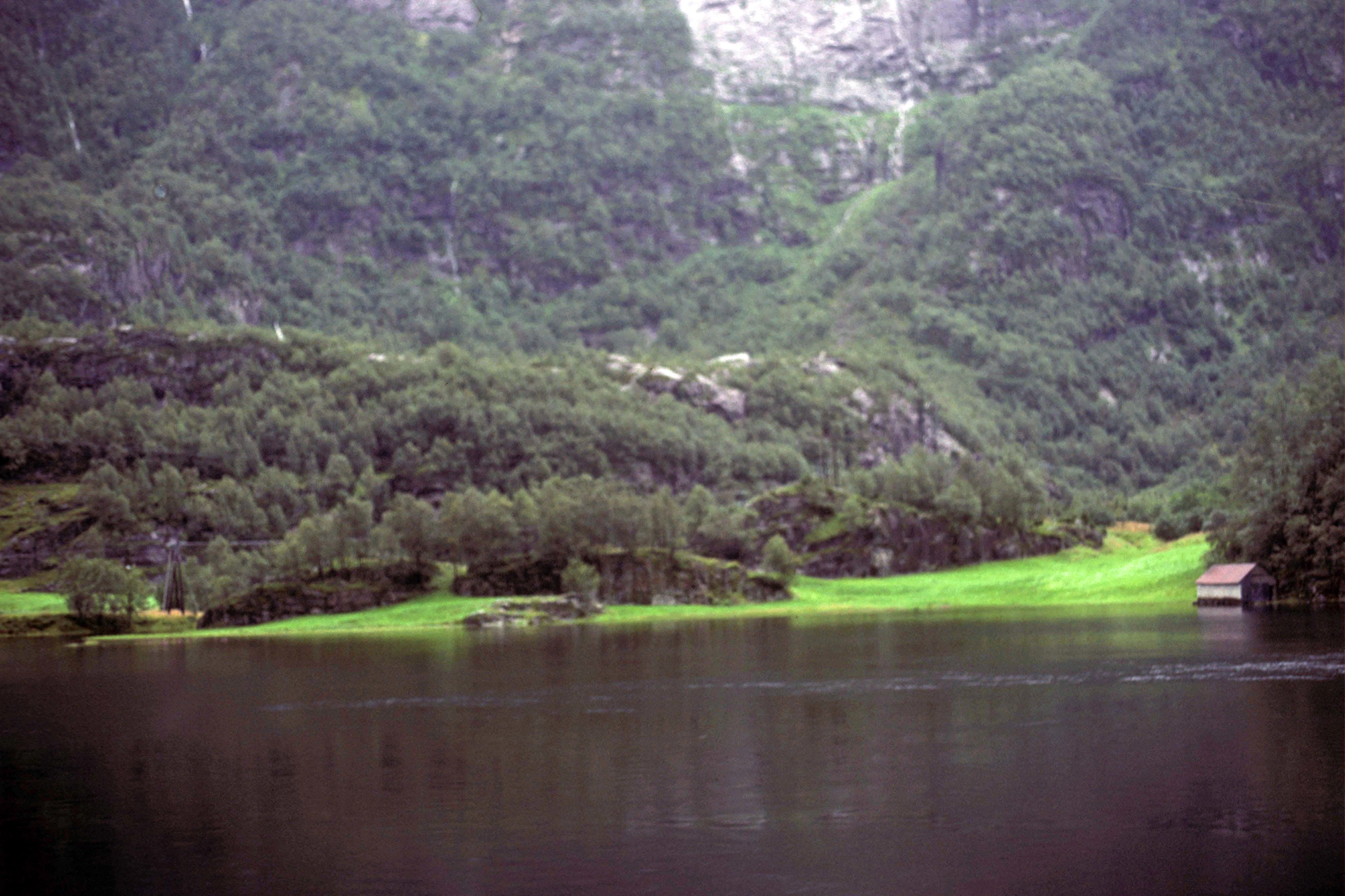 Mountains looming beyond the lake, seen from the Bergen–Voss train.