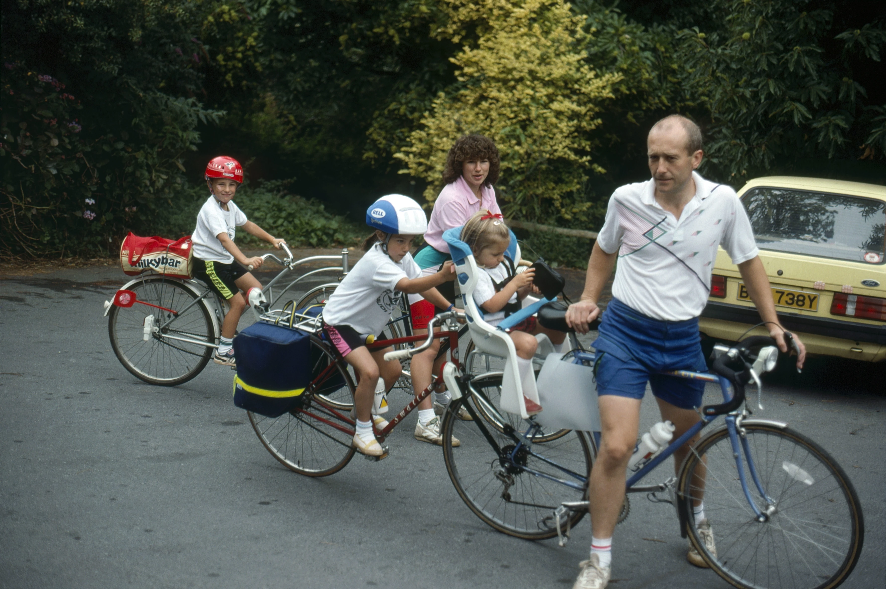 Ken’s family leaving Salcombe Youth Hostel car park: Karina on Ken’s Rann trailer, Ben on Julie’s, Roxanne on her own bike in the middle.
