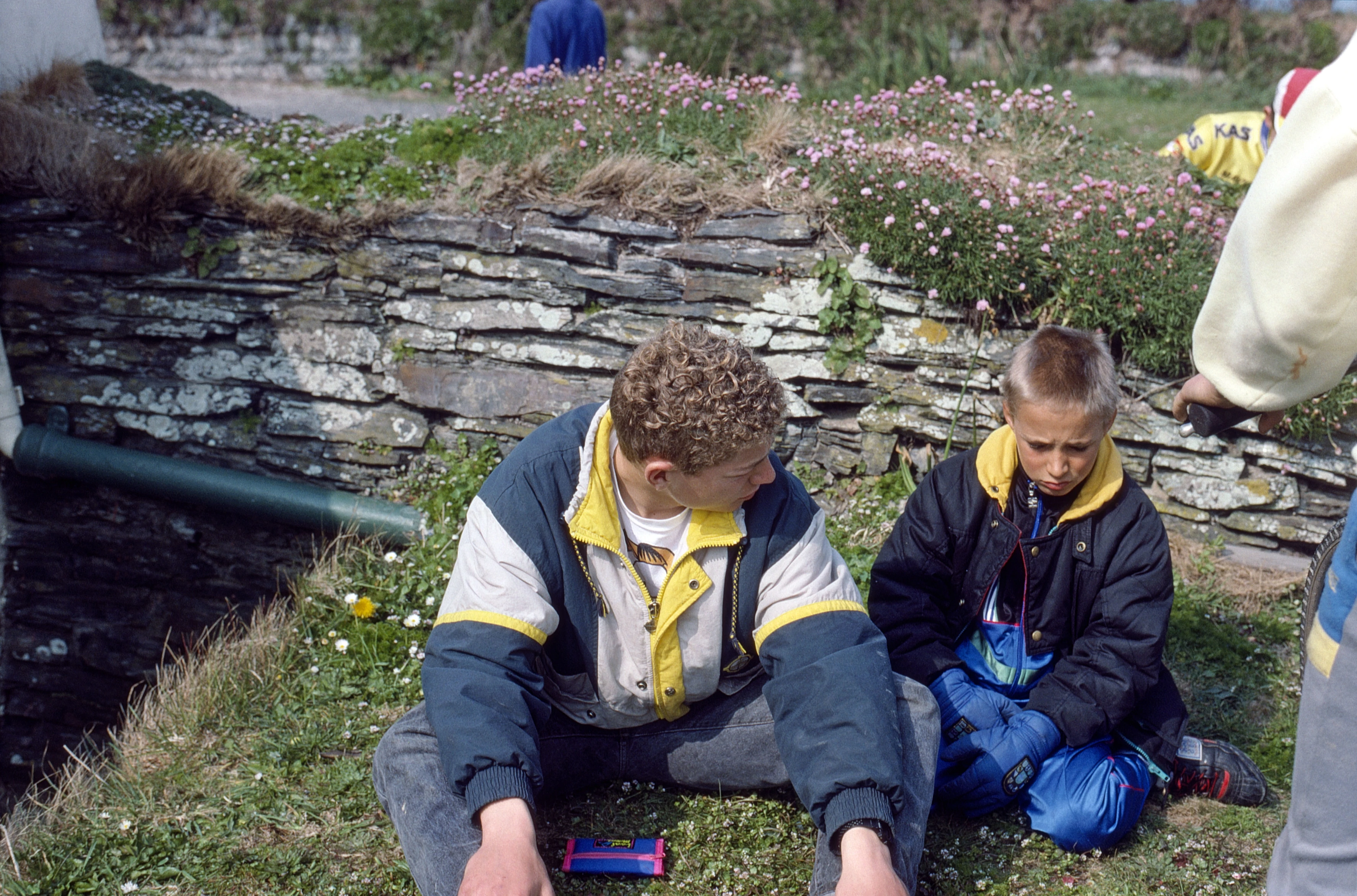 Warren Masters and Philip Harler enjoy the sun in the hostel garden before heading for Harlyn.