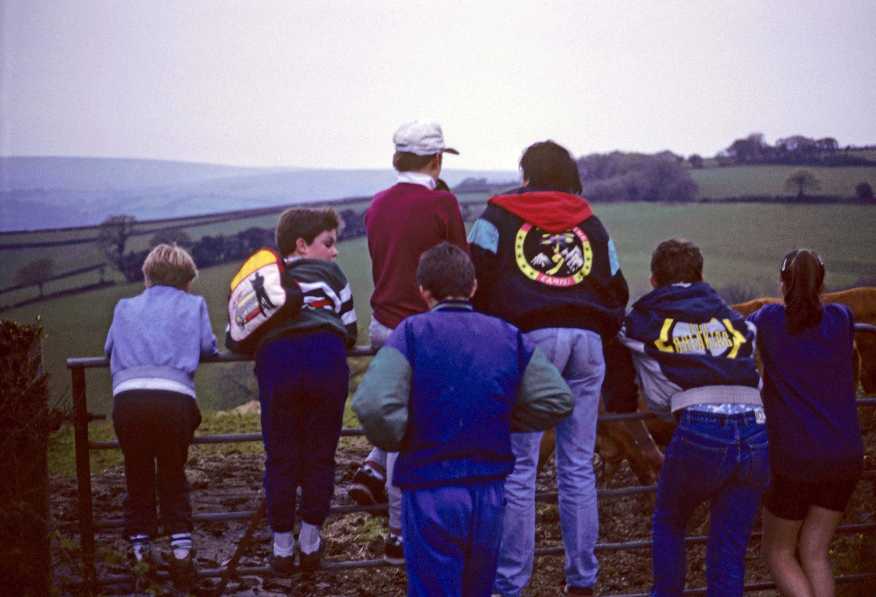 Admiring rolling Dartmoor fields from the gateway atop Magpie Hill: Toby, Alan, Shane, Martin, Andrew and Catherine, with Dayle behind.