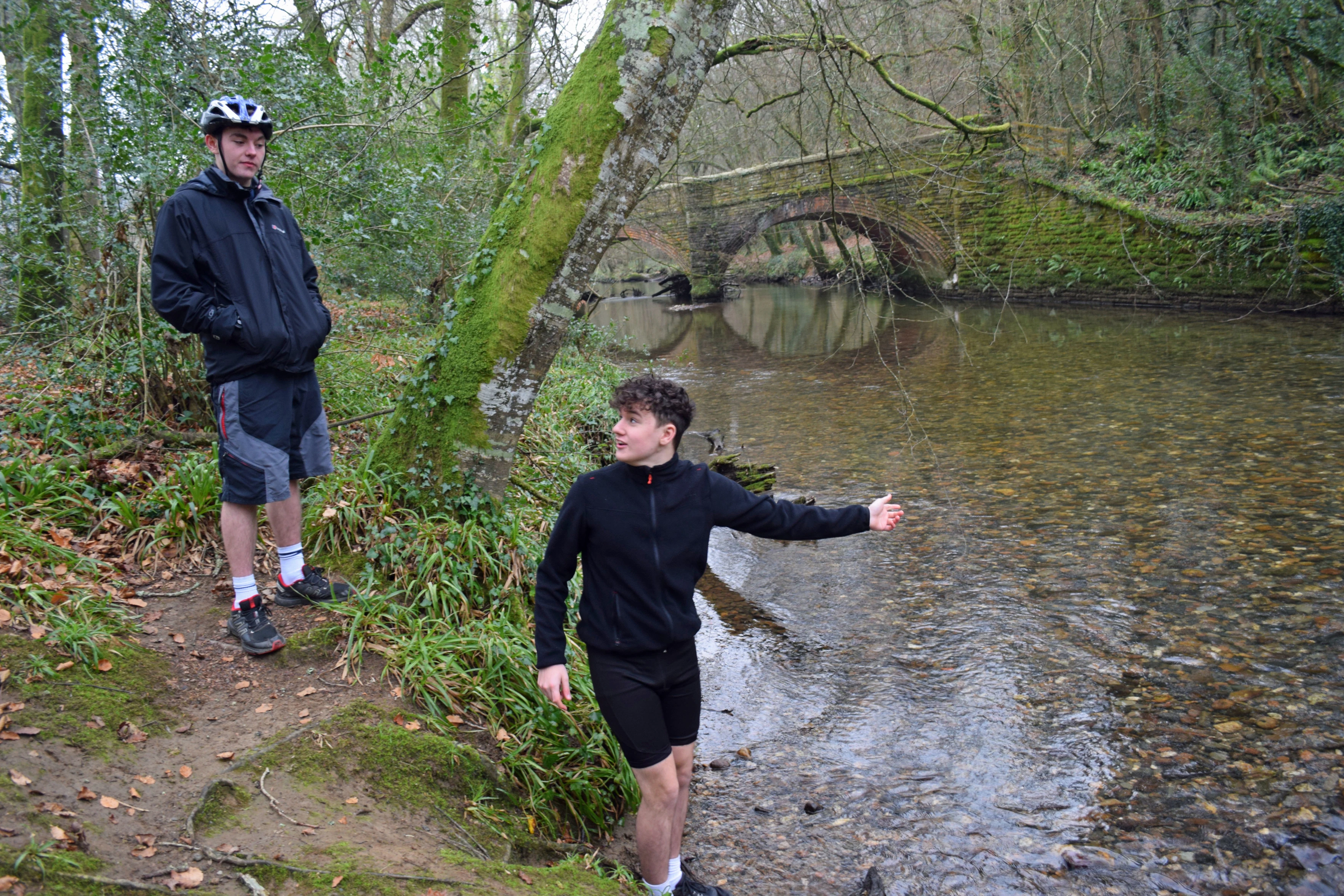 The River Avon near Reveton. The railway path we will join crosses the old viaduct.