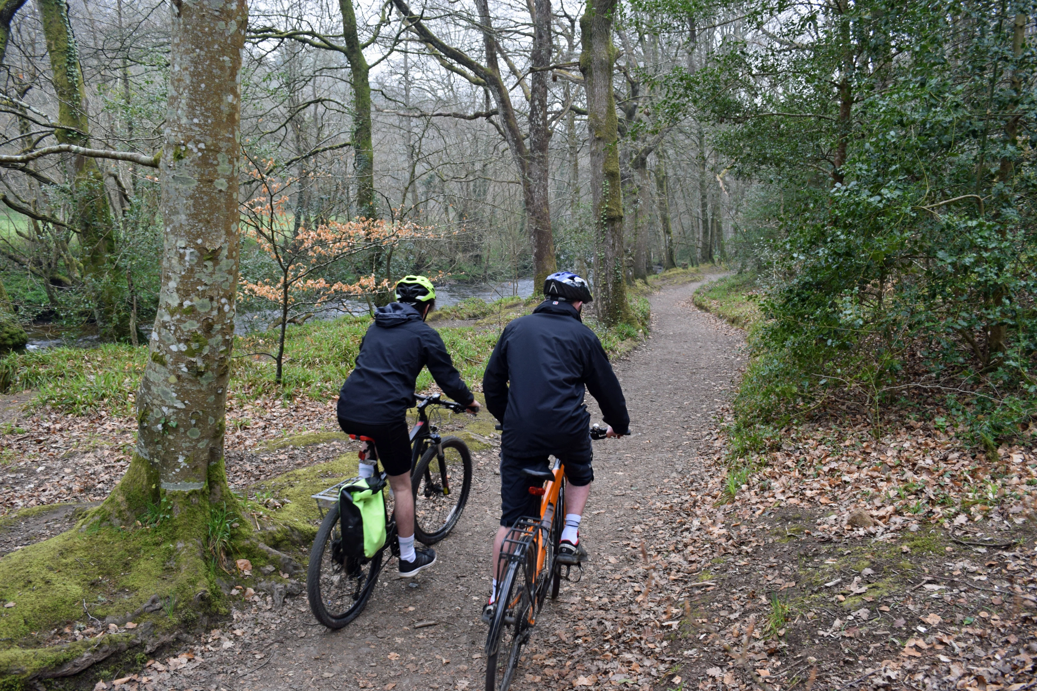 Jude and Dillan roll through Dunsford Wood from Steps Bridge, beside the Teign.
