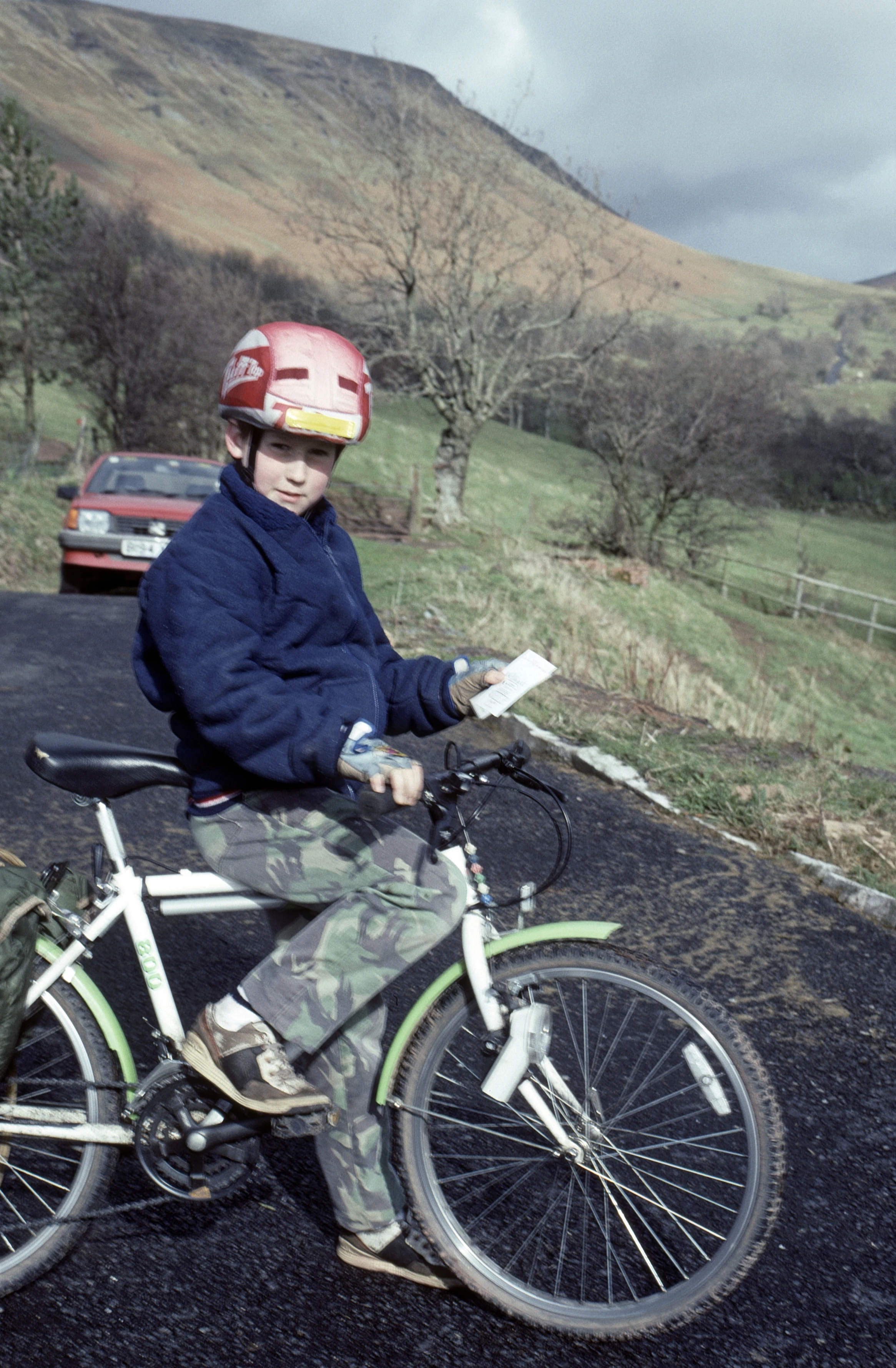 Joseph Bellows on the hostel drive with his stamped YHA card on a fine sunny morning