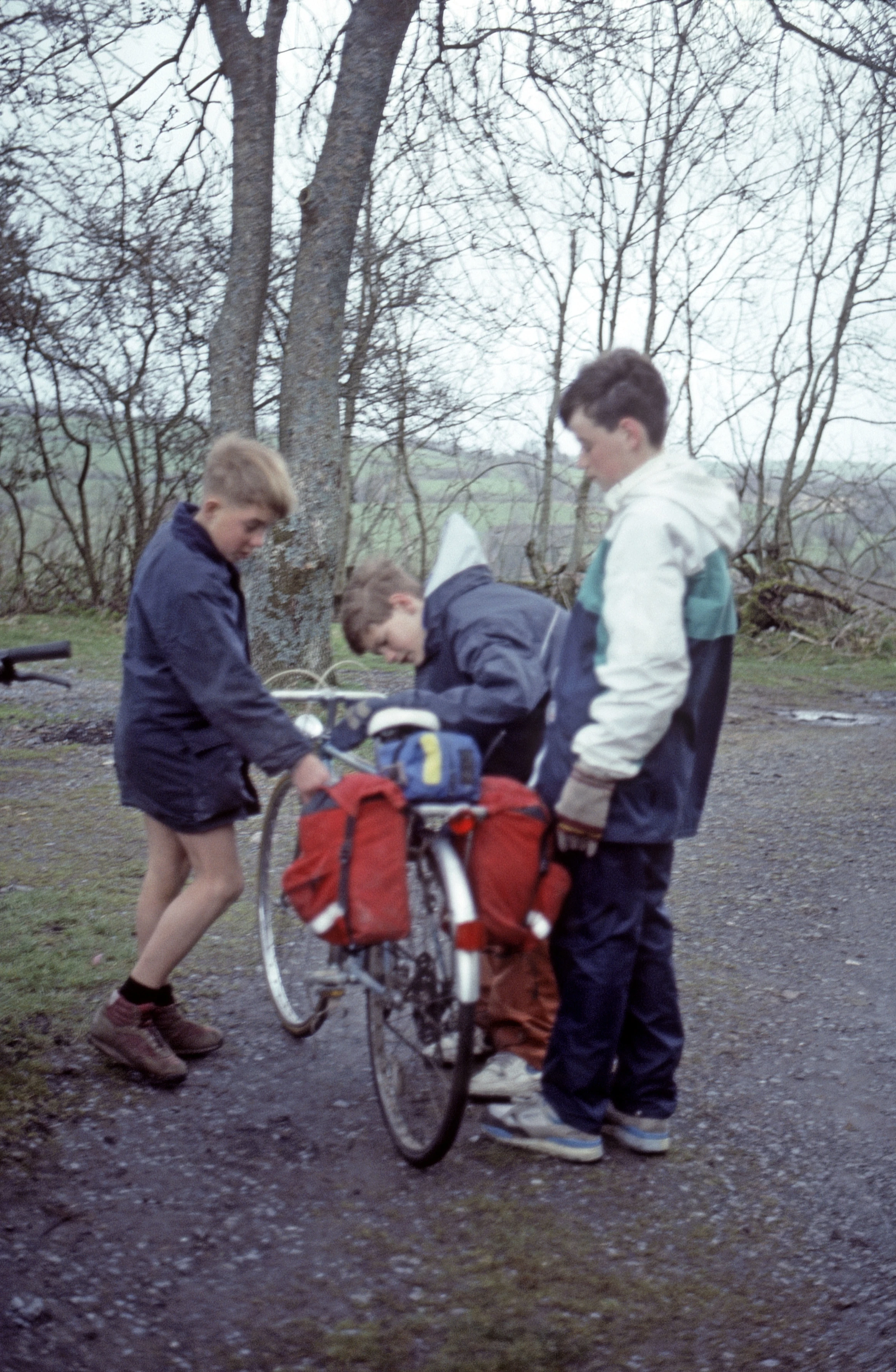 David Platt helps Matthew and Thomas Crabtree load bikes outside Llandeusant Youth Hostel.