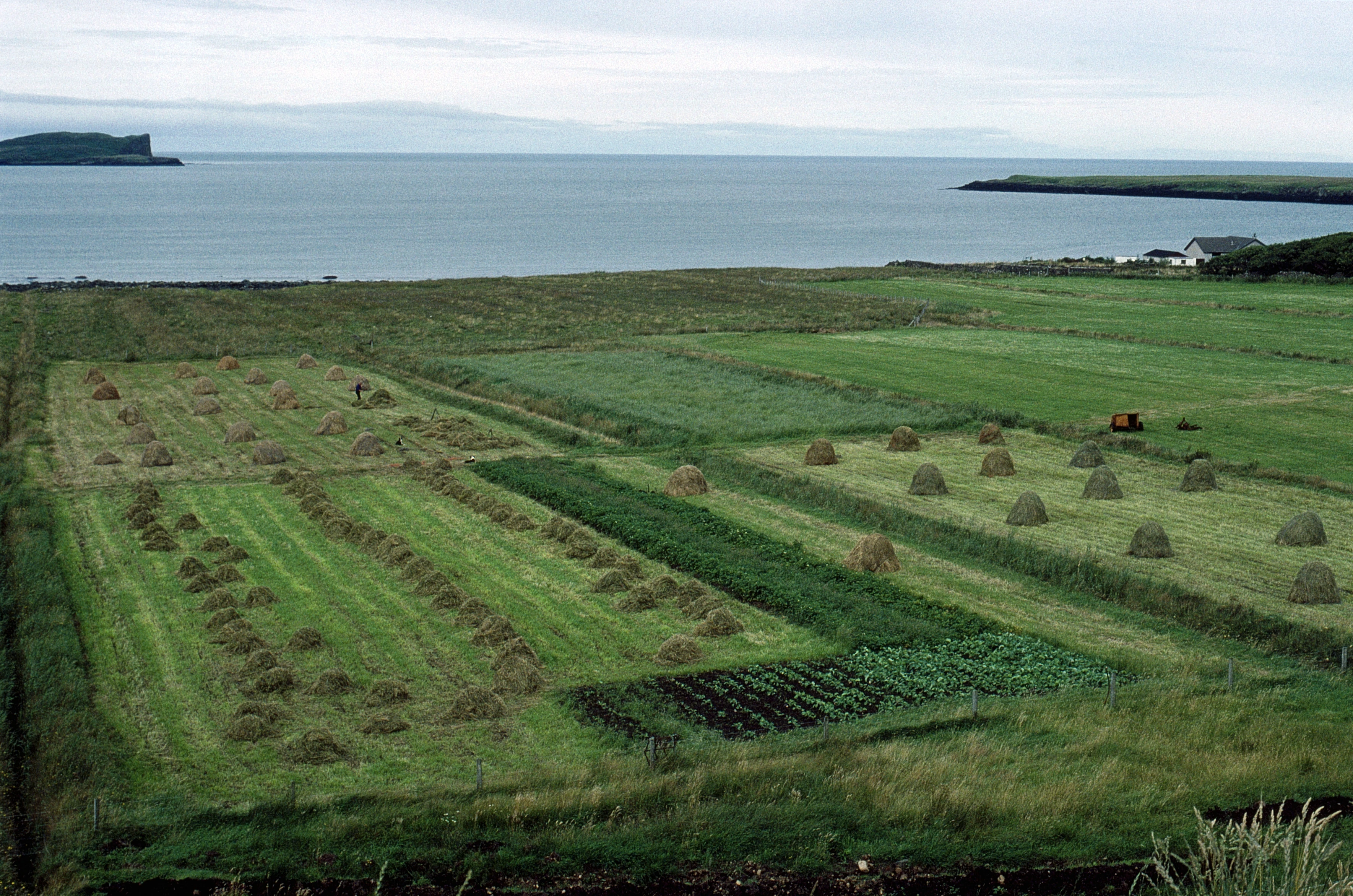 Traditional hand haymaking at Stenscholl, Staffin Bay; Staffin Island to the right.