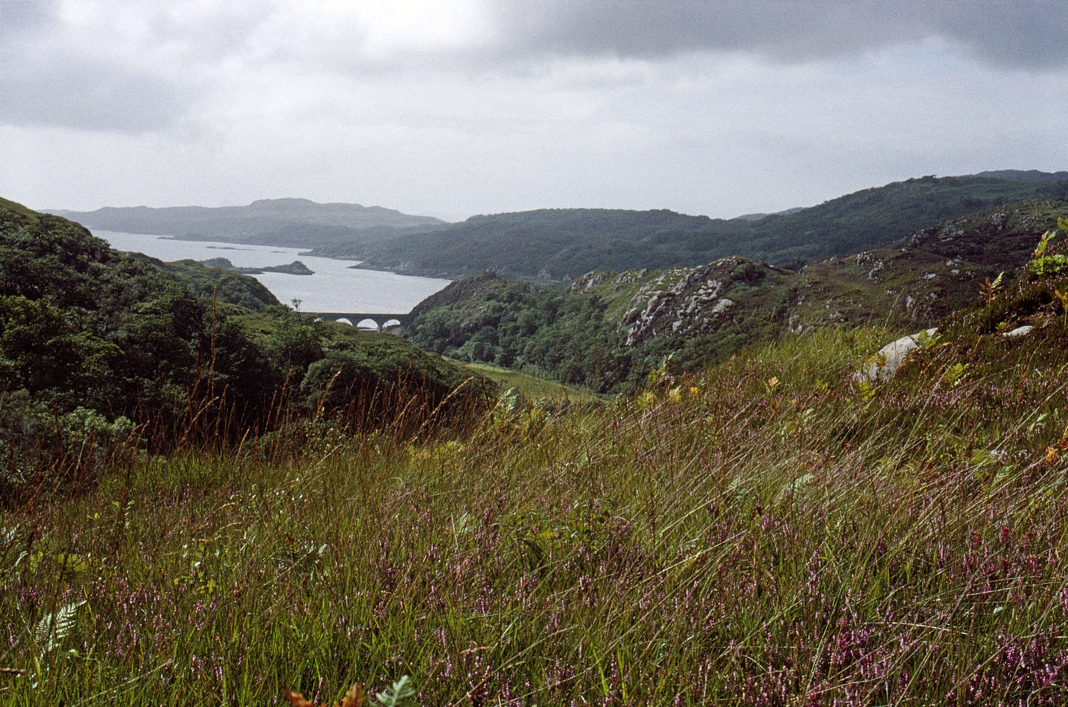 Michael climbed a steep bank for this view of the viaduct near Polnish, with Loch nan Uamh beyond.