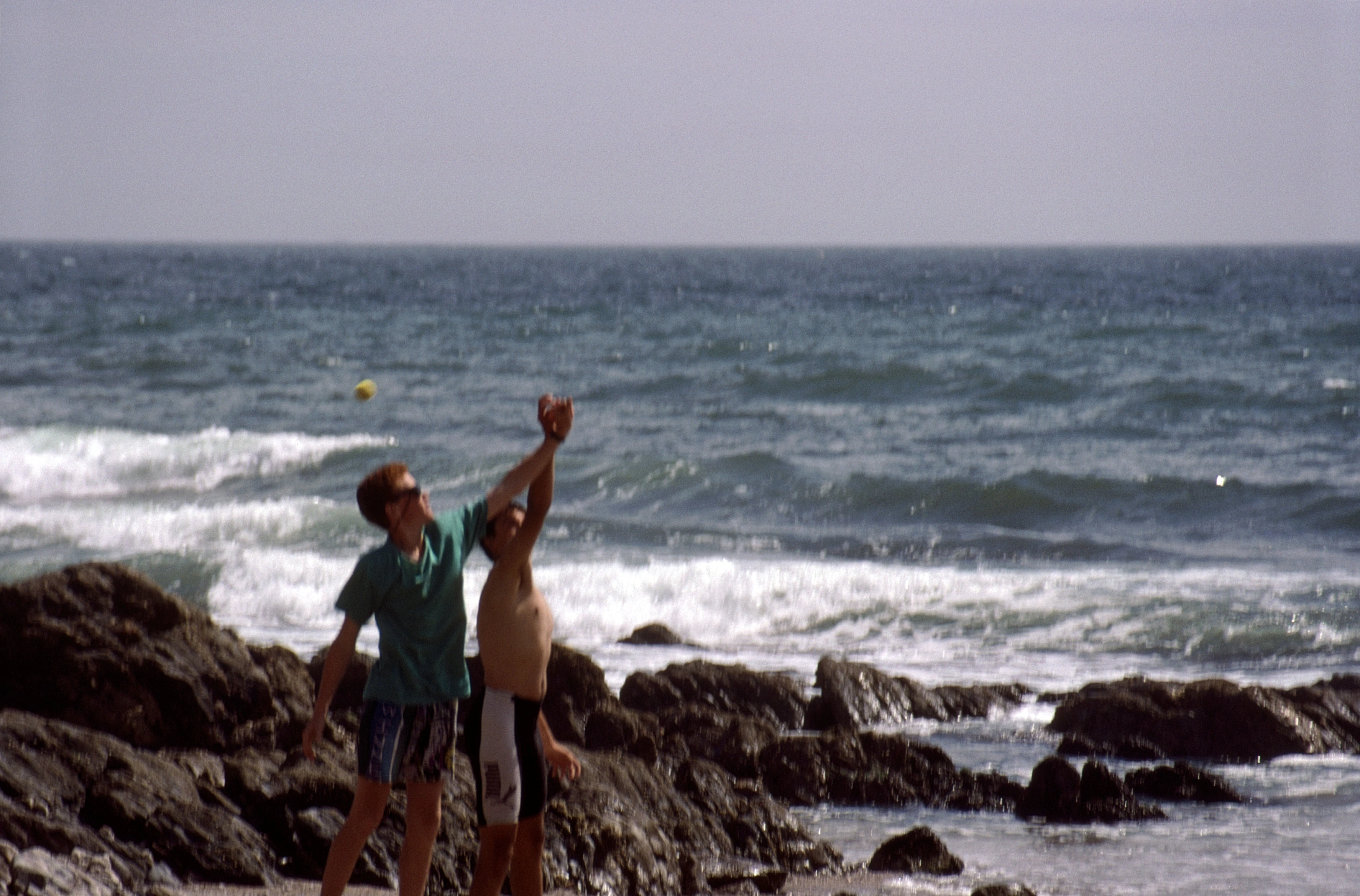 Roger and Martin miss the tennis ball at Lannacombe Beach.