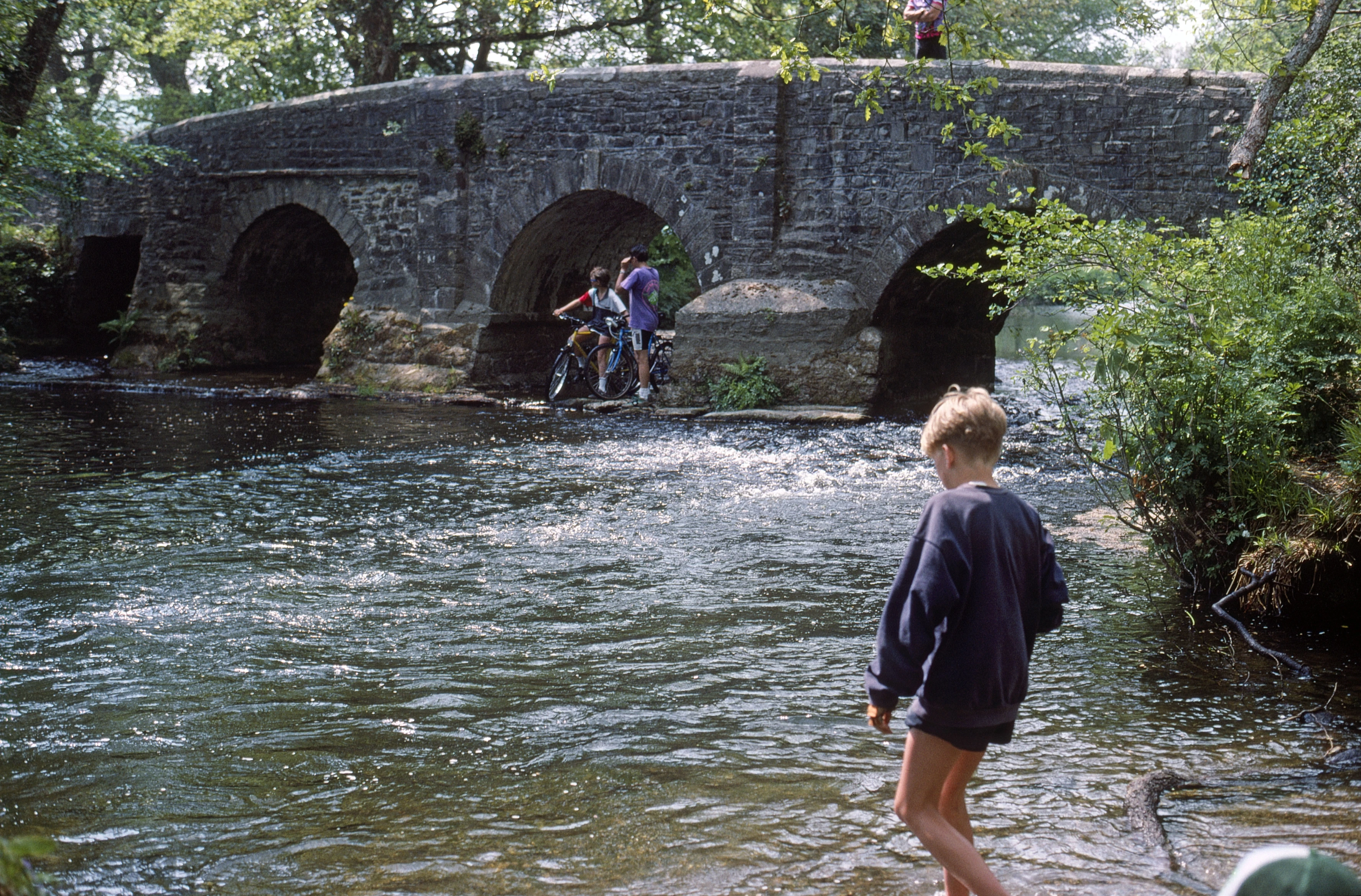 Martin Rushworth, Martin Hills and David Platt ford the River Lynher beneath the bridge near Bramble Wood, Pillaton.