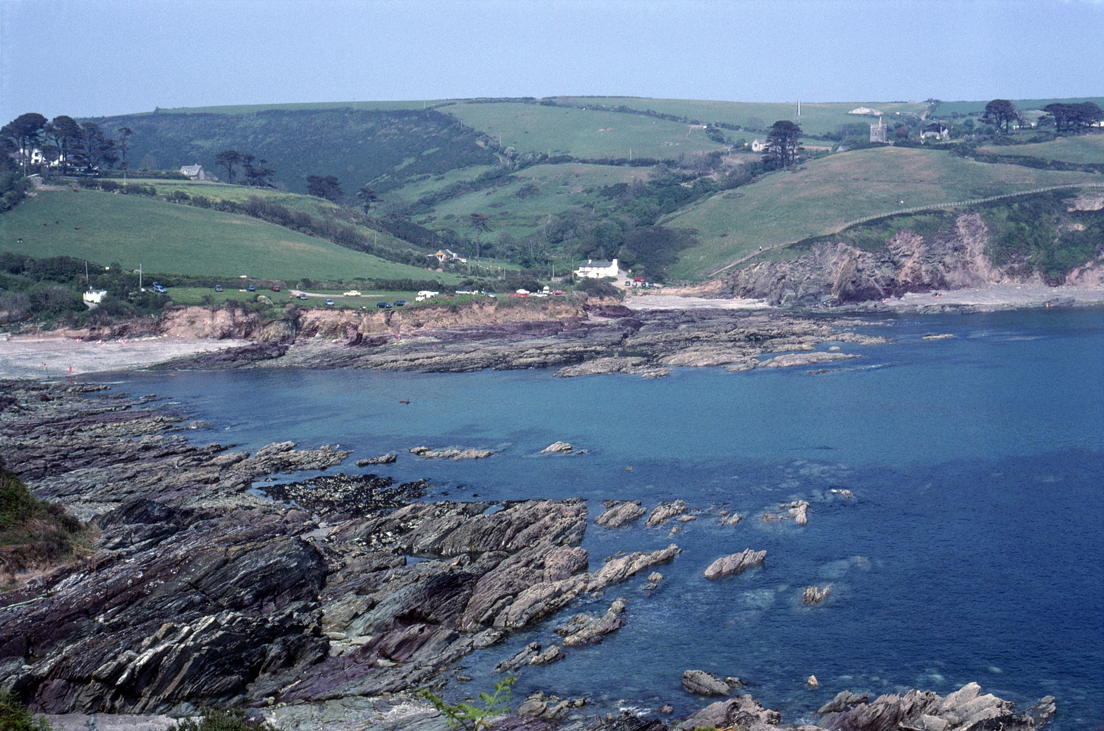 Looking back to Talland Bay from the coast path to Polperro; Smugglers Rest café just right of centre.