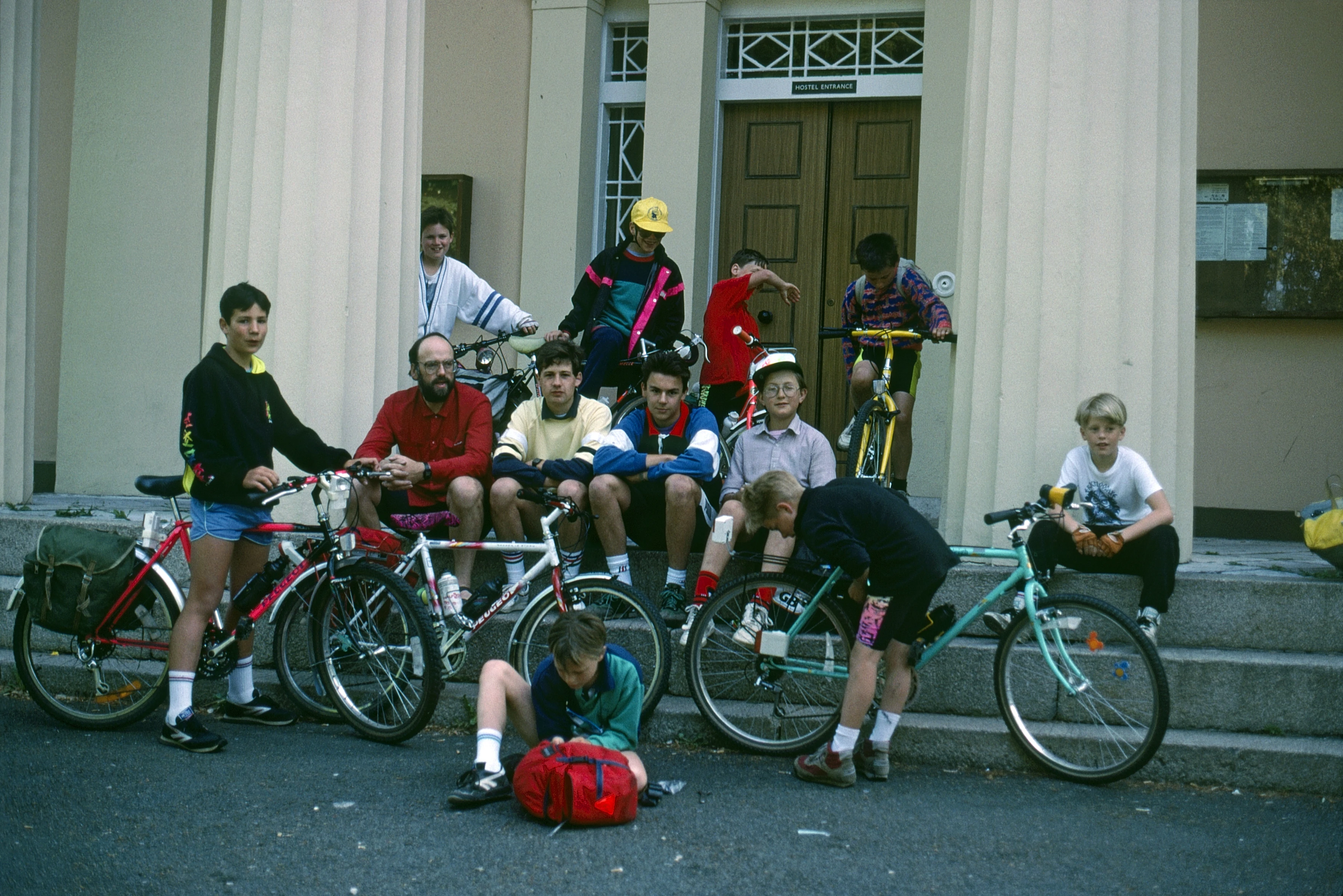 The group outside Plymouth Youth Hostel, ready to roll.