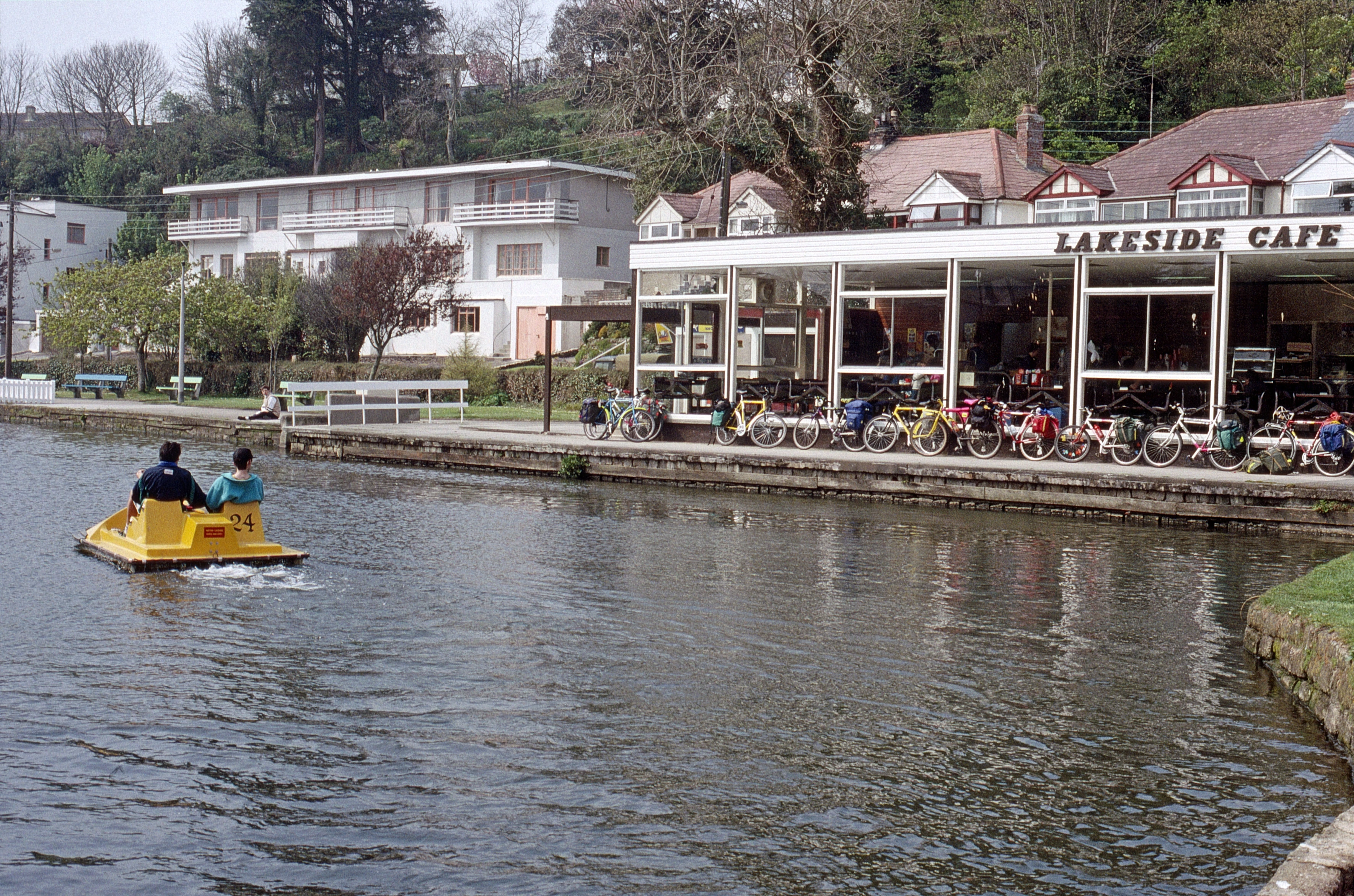 Martin Hills and Ian Gibbs pedal past Lakeside Cafe in Trenance Park, Newquay.