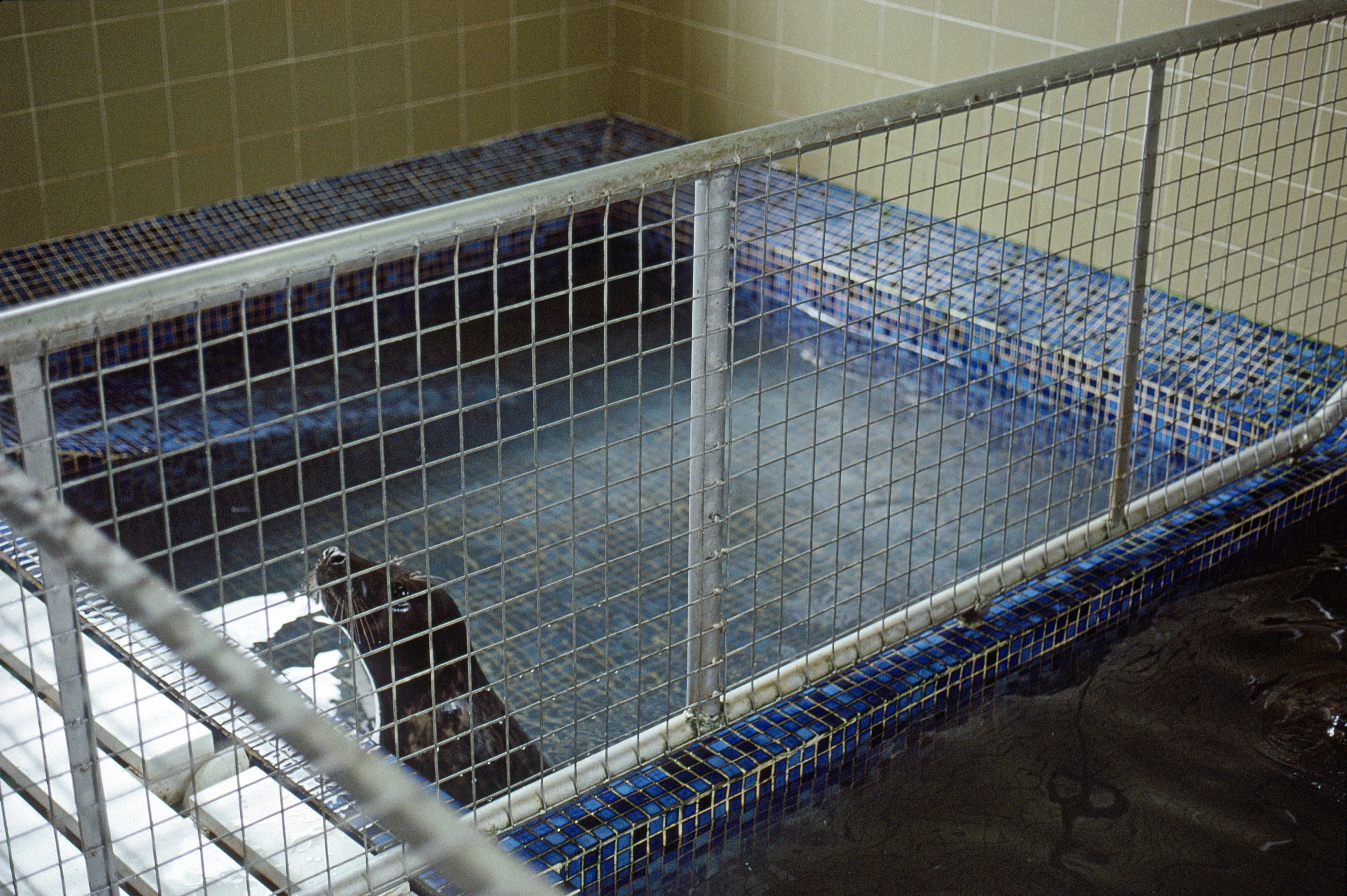 A recovering seal in the convalescence hospital at Gweek Seal Sanctuary—halfway back to the entrance.