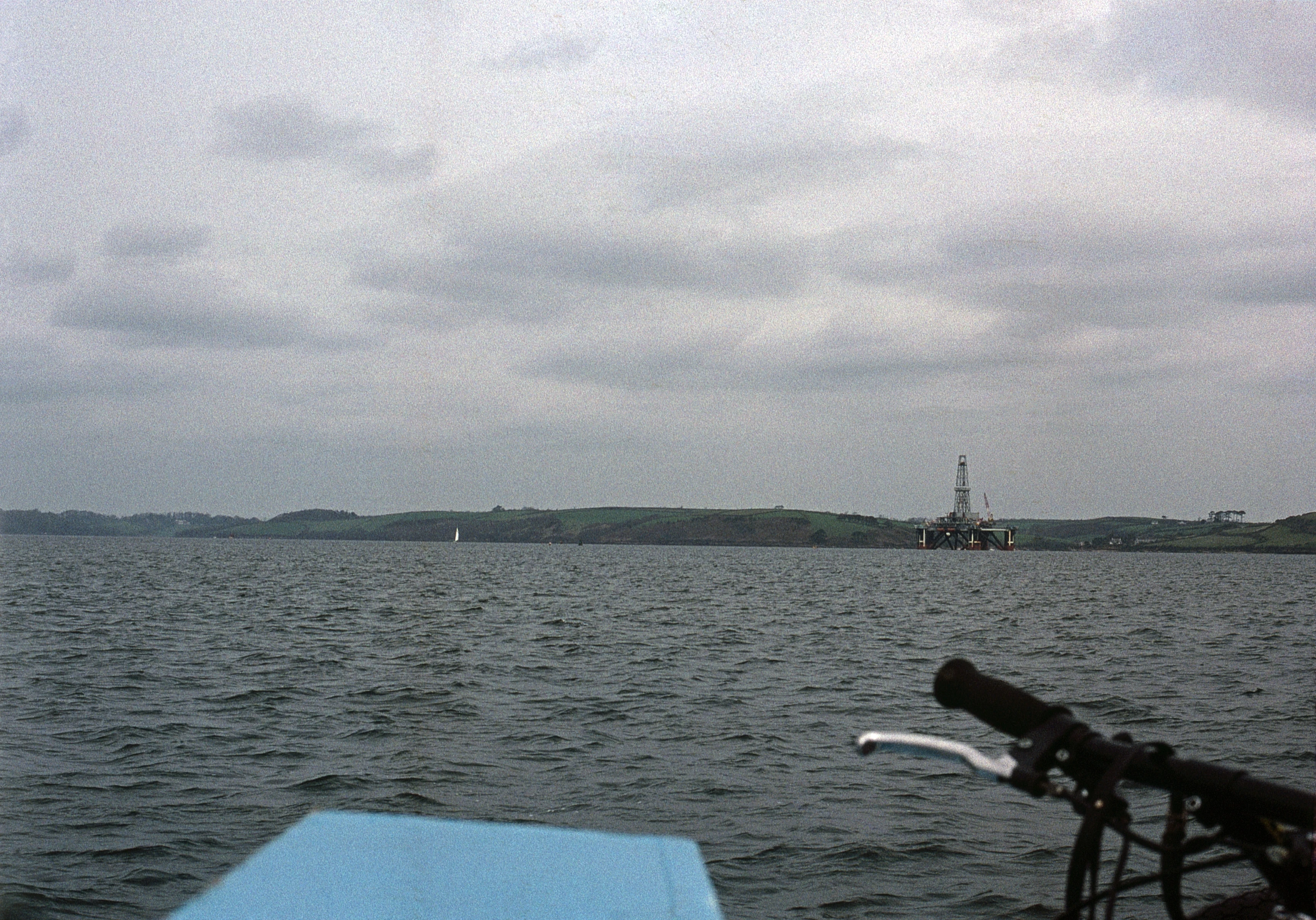 An oil rig in Falmouth Bay, seen from the St Mawes ferry.