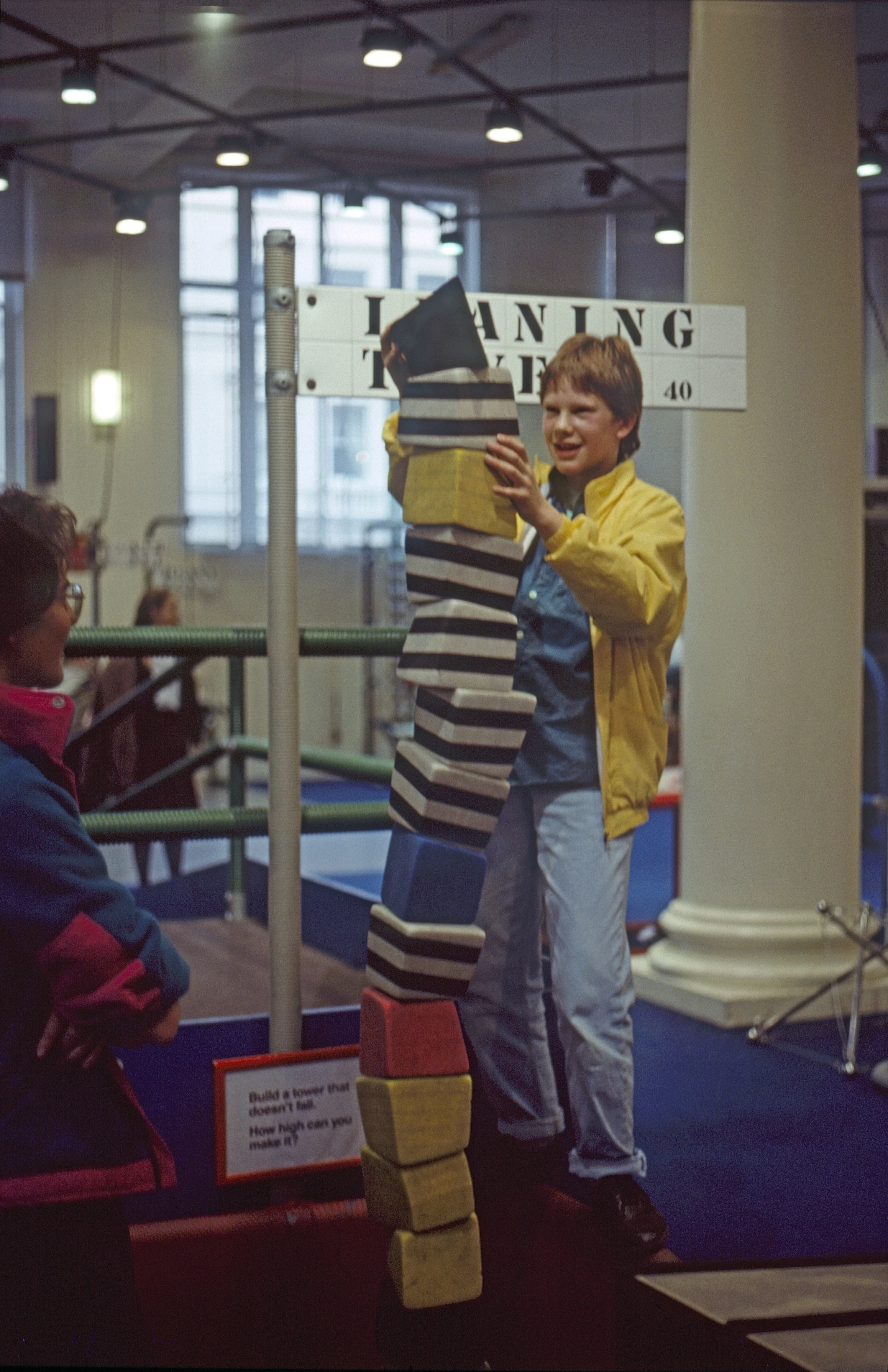 Philip Robinson builds a tower at Launchpad, Science Museum, London, as Simon Hopper looks on.