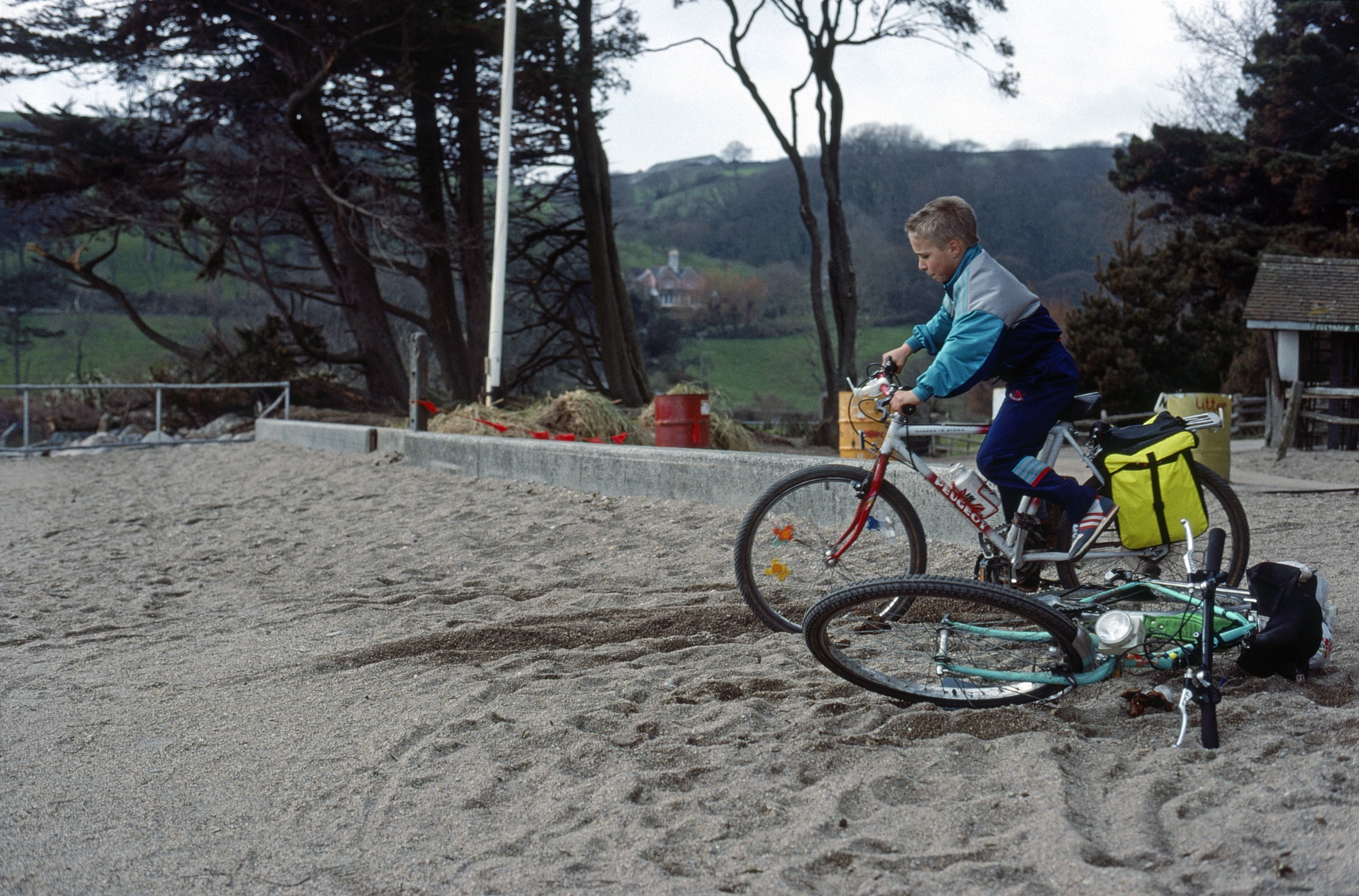 Philip Harler tries riding the sand at Blackpool Sands—almost the only part not destroyed by recent storms.