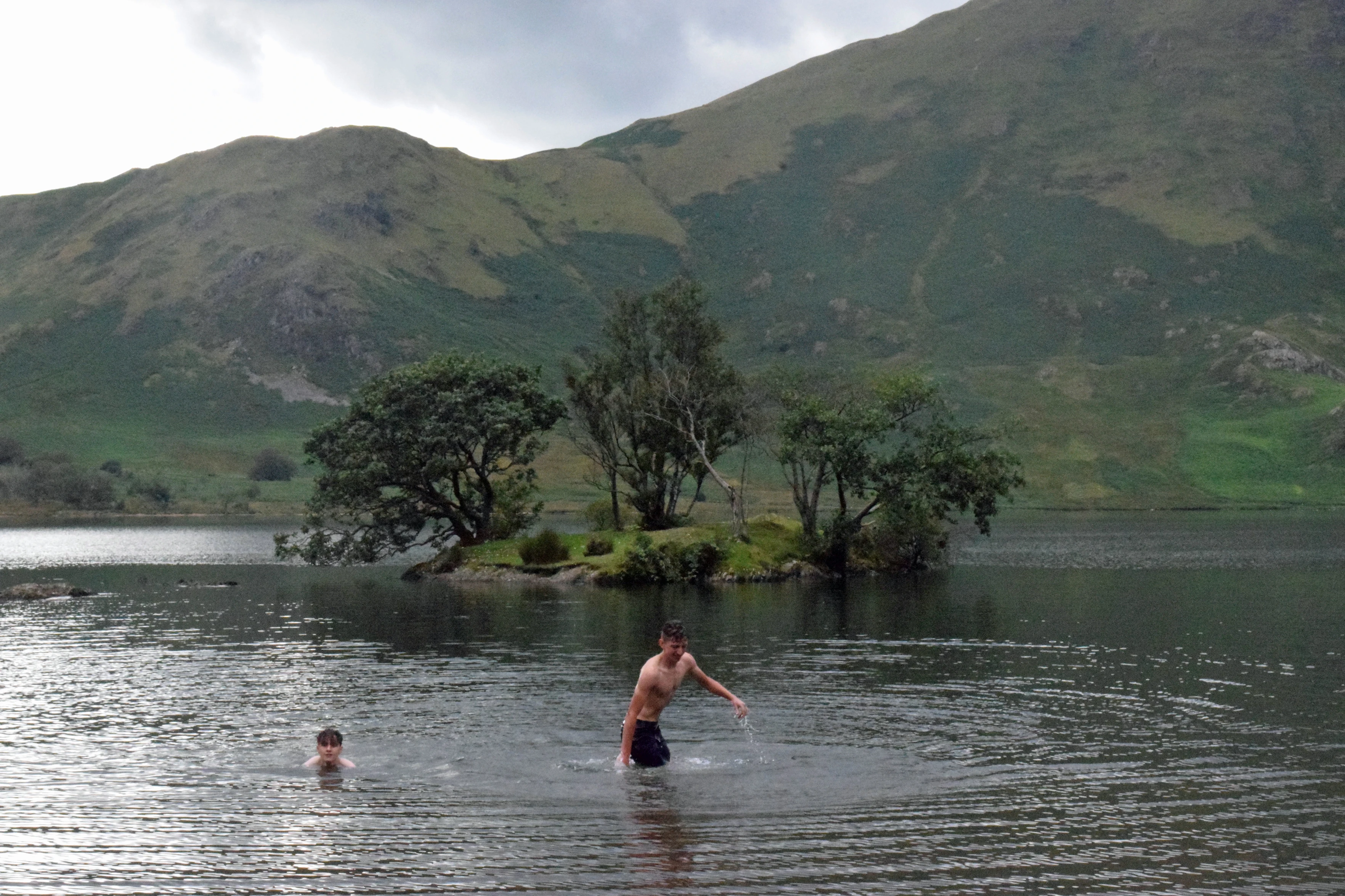 Jude and George swim back from Woodhouse Island to shore, Crummock Water