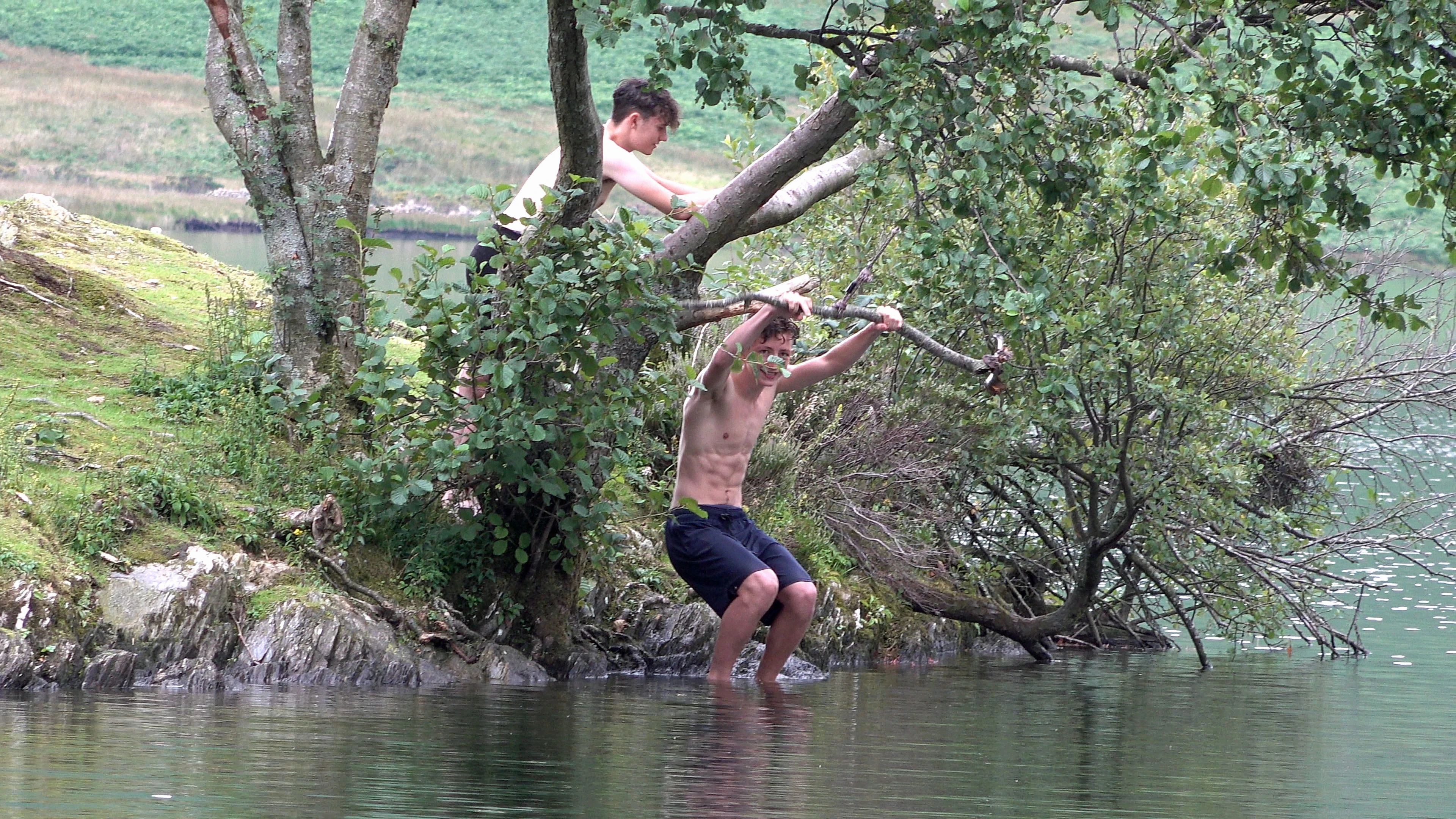 George considers trying his new swing rope on Woodhouse Island, Crummock Water