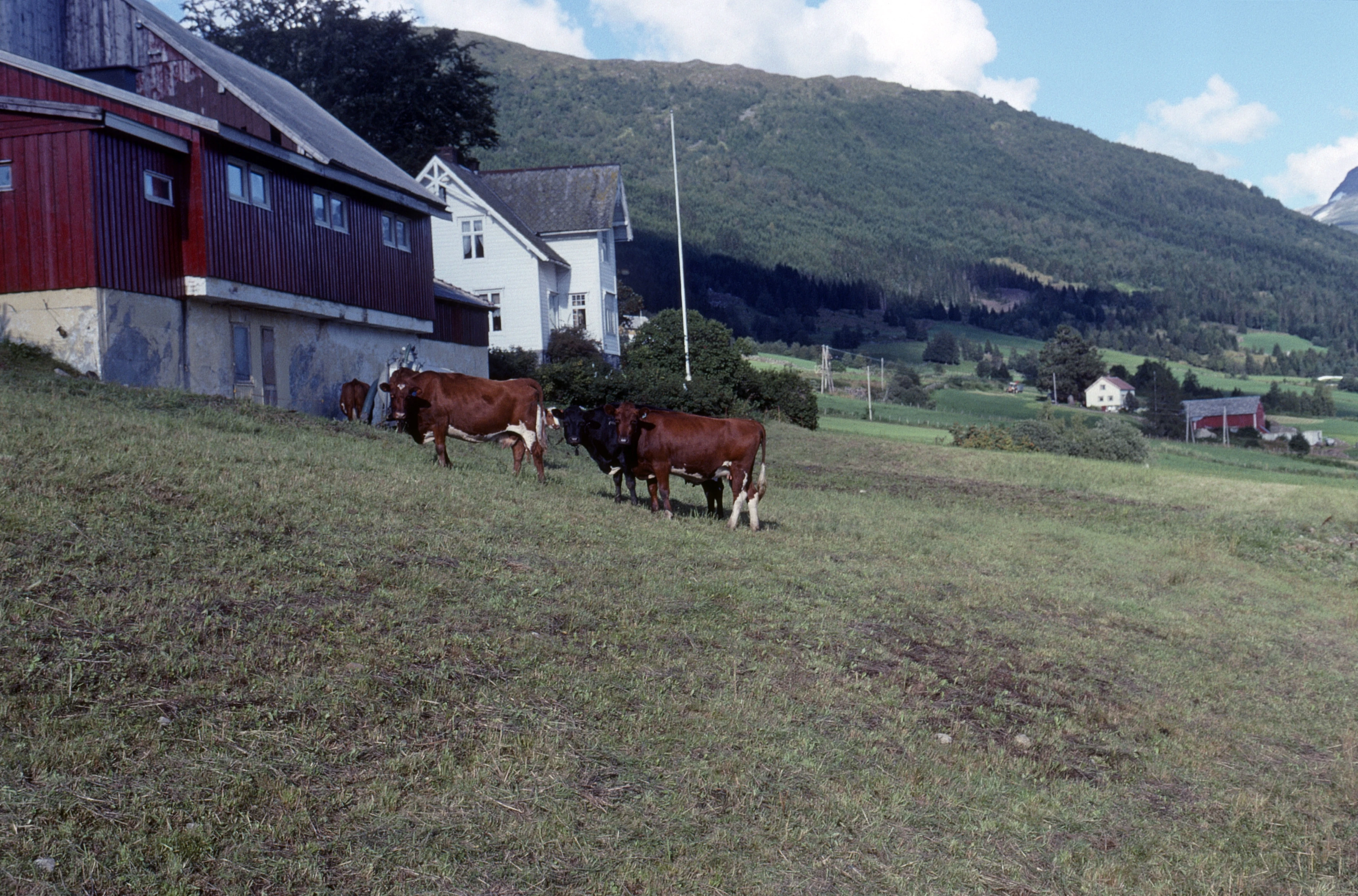 Small farm at Moldestadvegan approaching Byrkjelo, with Norwegian cows grazing the slope.